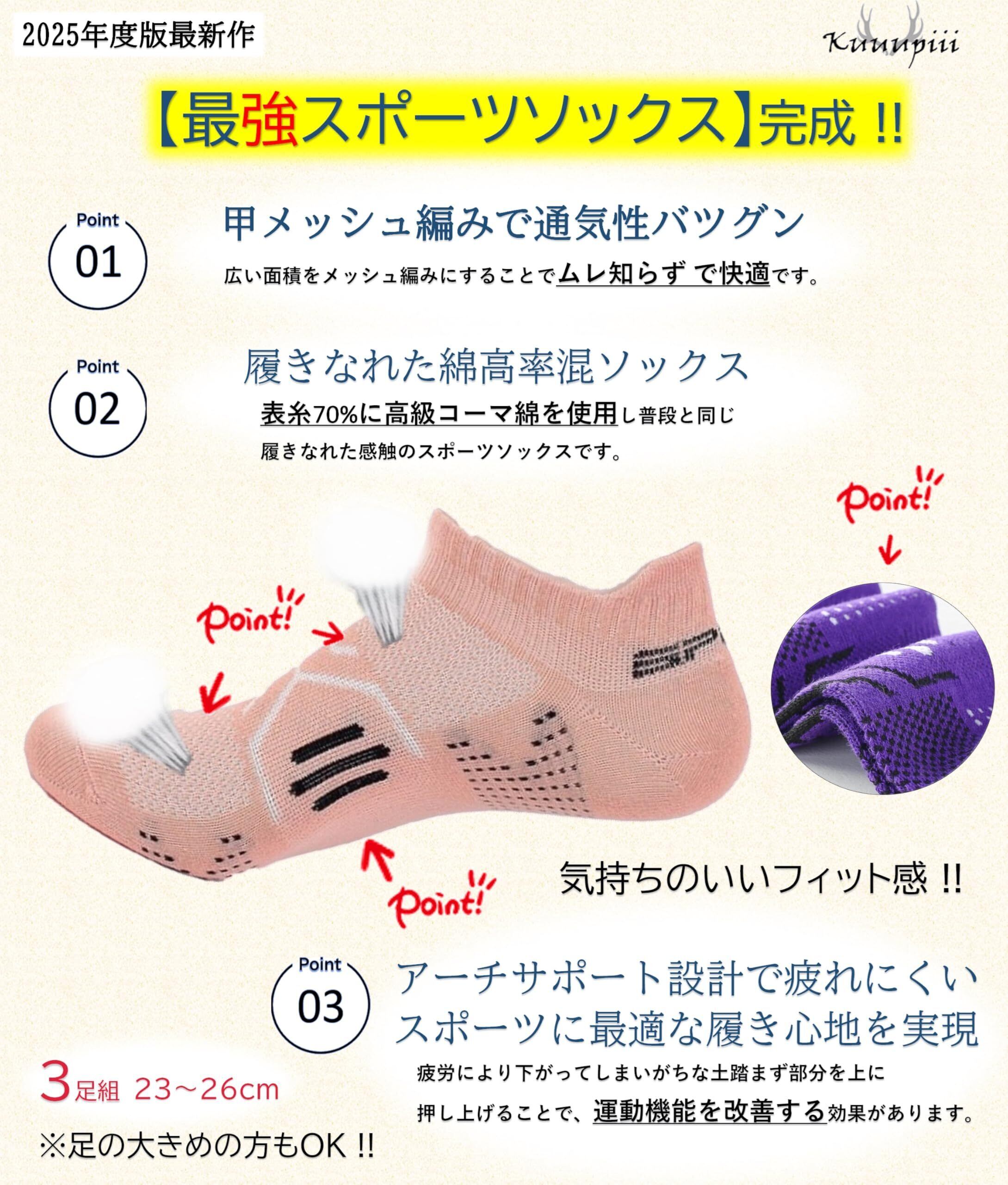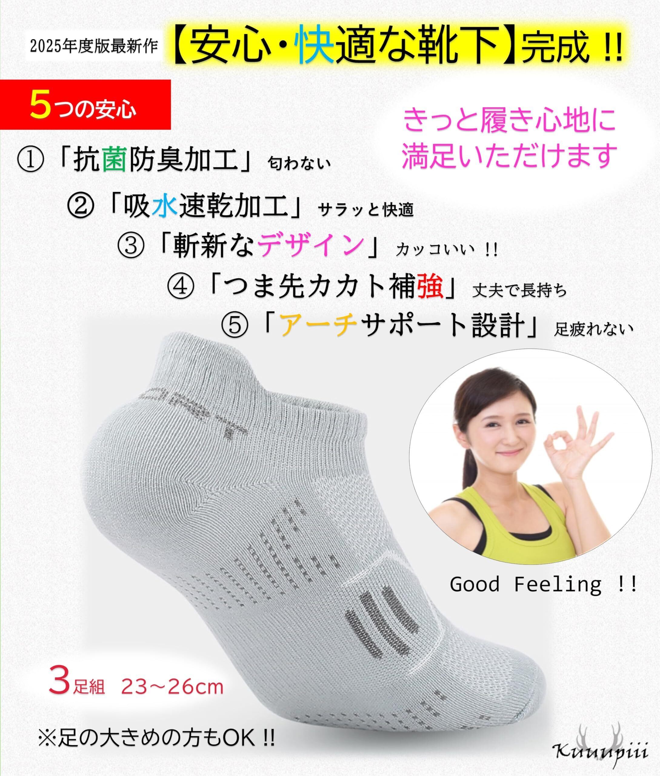【Kuuupiii スポーツソックスの特徴】 ①立体設3D構造+アーチサポート機能で今までにないフィット感+機能を実現 ②足底部分を「新特殊足底凸凹設計」にすることで従来の通気性・クッション性だけでなく、アスリートの全方向への 動きに対応できる特別仕様のソックスとなっております。 ③足底の「新特殊足底凸凹設計」は、汗を吸う吸汗性にも優れ運動中の快適さをキープします。 ④スポーツソックスの基本として、甲部はメッシュ編みにすることにより汗を素早く放出する速乾性に優れています。 (当社製品比、速乾性約50%up) ⑤独特のヒールカウンターデザインによりアキレス腱を保護し、同時に脱げにくくなりました。 ⑥アーチ・サポート構造は運動による足の疲れを軽減し運動のパフォーマンスをupさせます。 ⑦素材は抗菌防臭加工で、気になる足のニオイを抑制します。