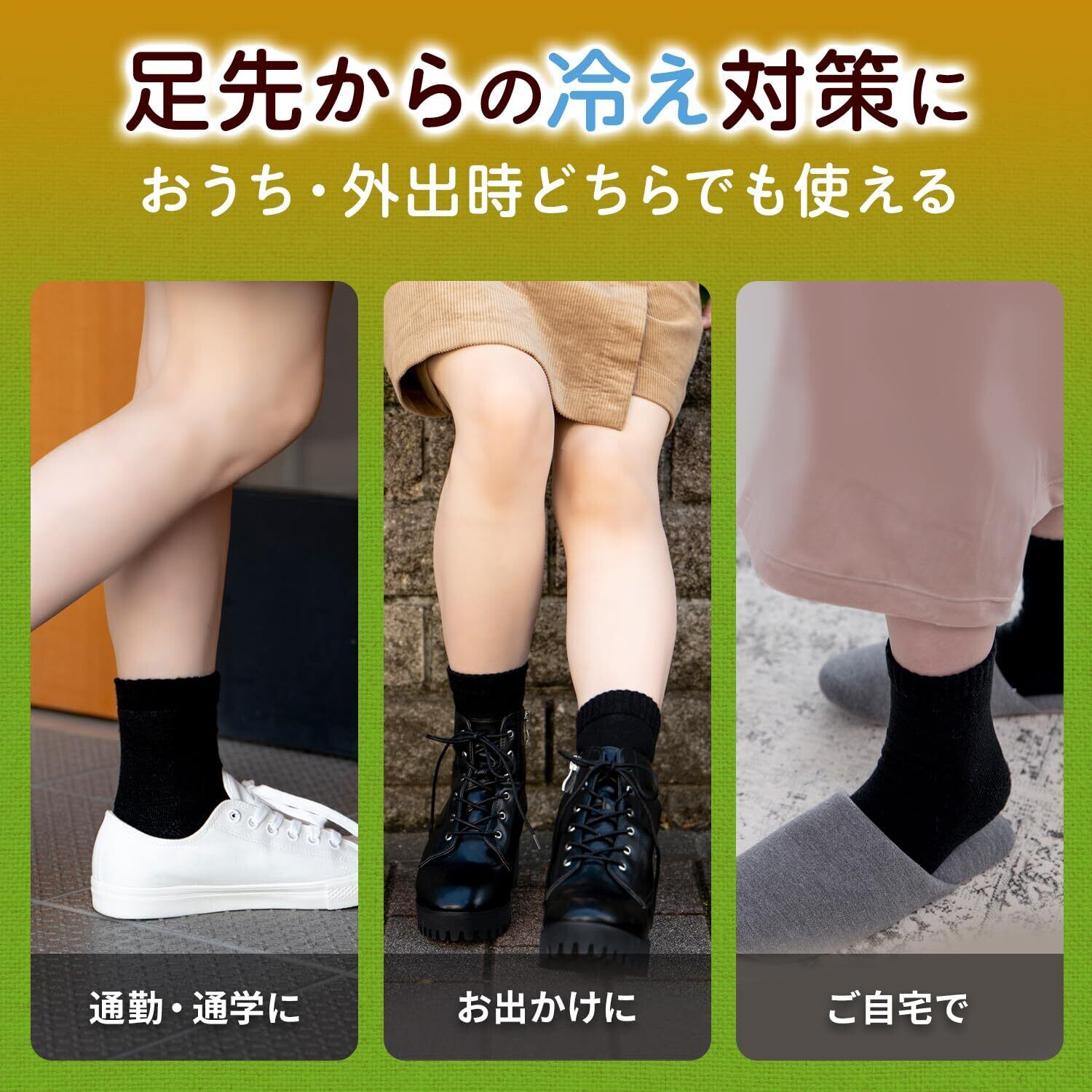 このクルーソックスは、足先からくるぶしまでを保温するために使われます。通常の靴下のように着用してください。