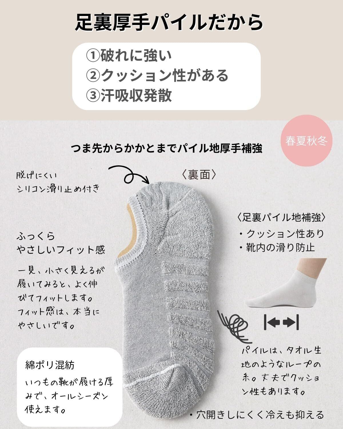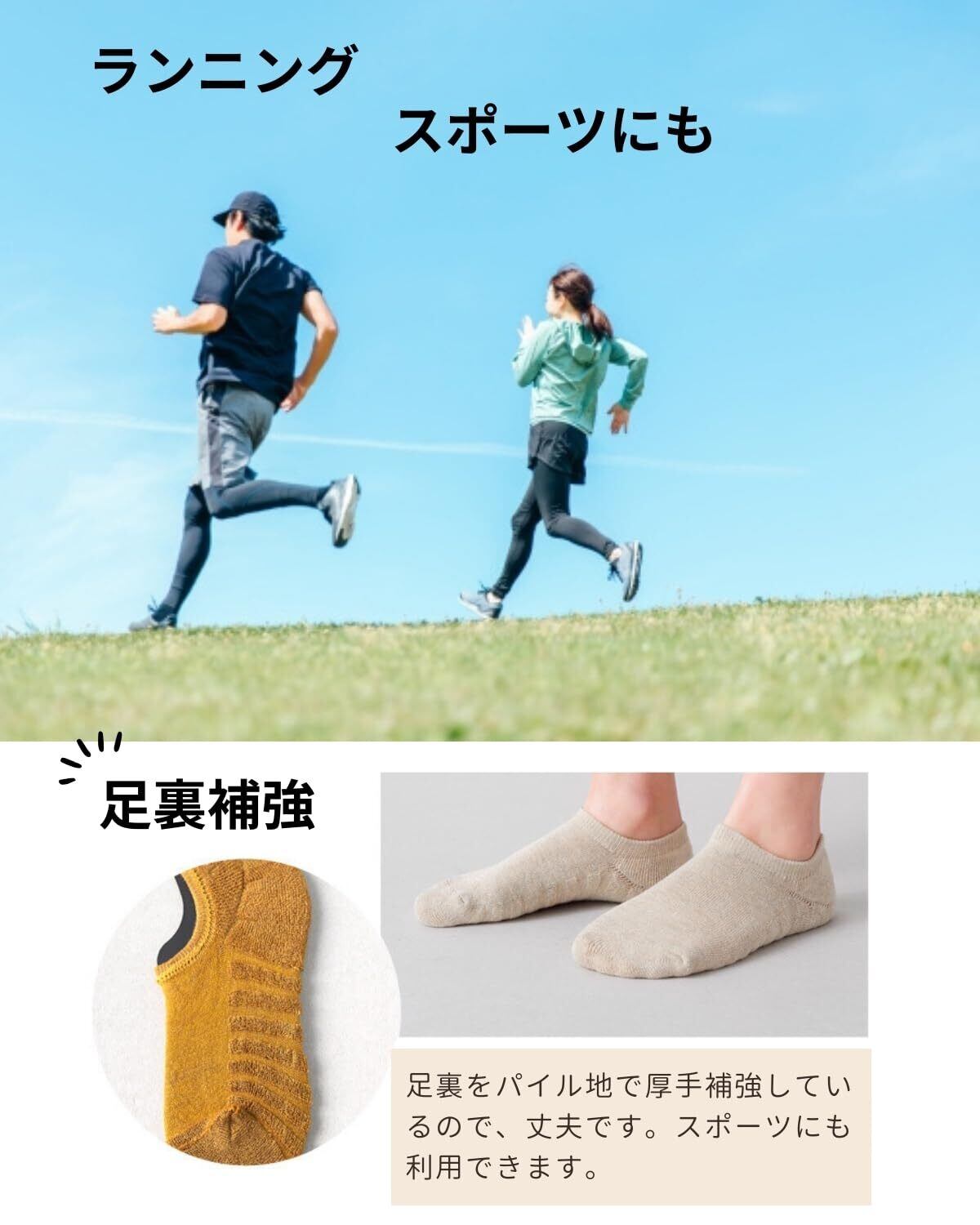 【スポーツソックスにも】足裏はパイル地で丈夫、クッション性もあるので、スポーツやランニング用にも使えます。※サイズぴったりの靴は少しだけきつくなります。