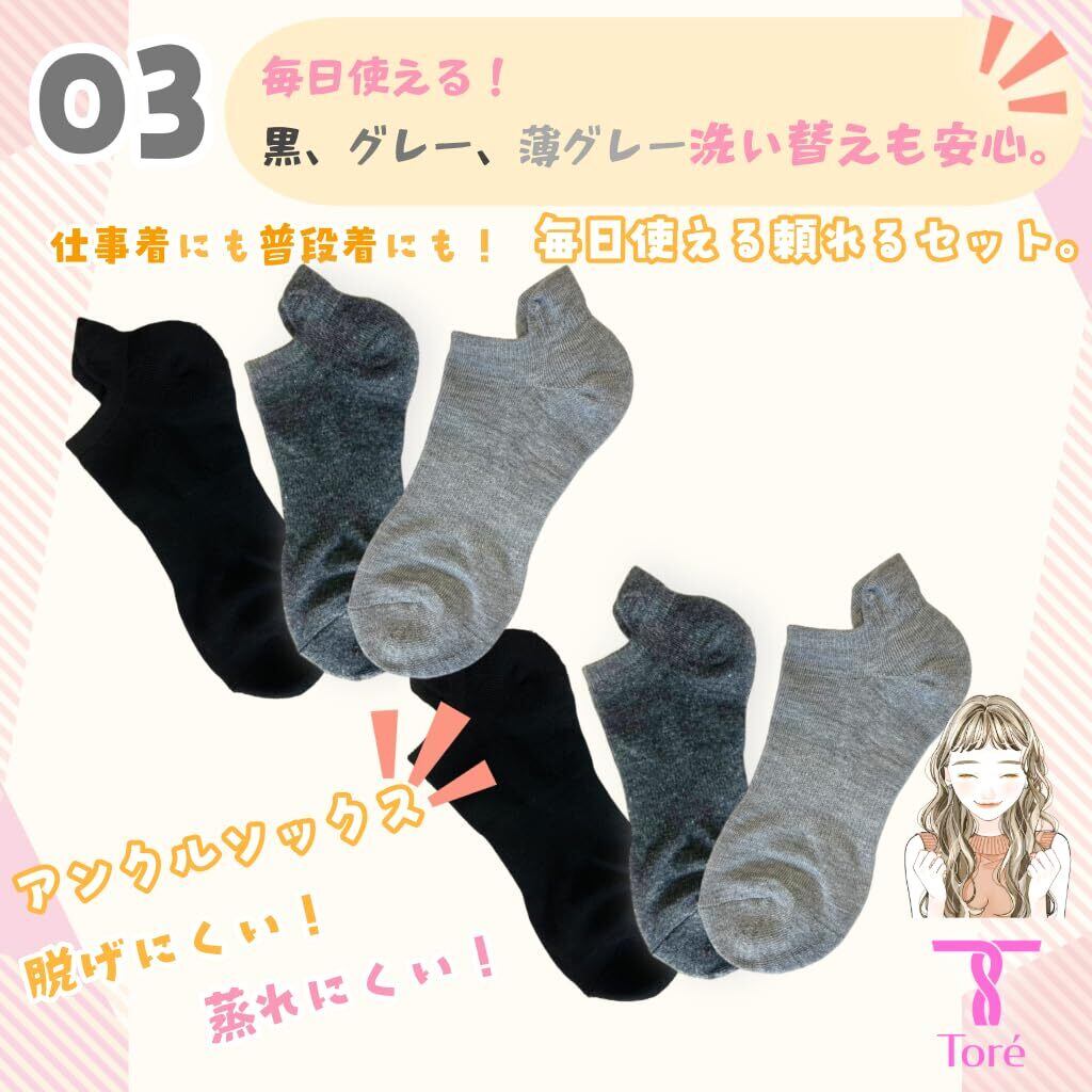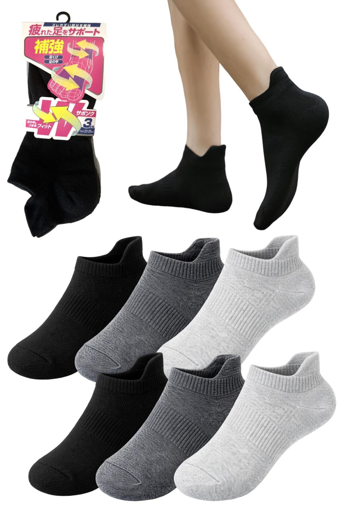 [Toré] 【トレ】 靴下 レディース スポーツソックス くるぶしソックス クルーソックス 綿 6足セット 23-25cm 黒 ブラック 灰色 グレー