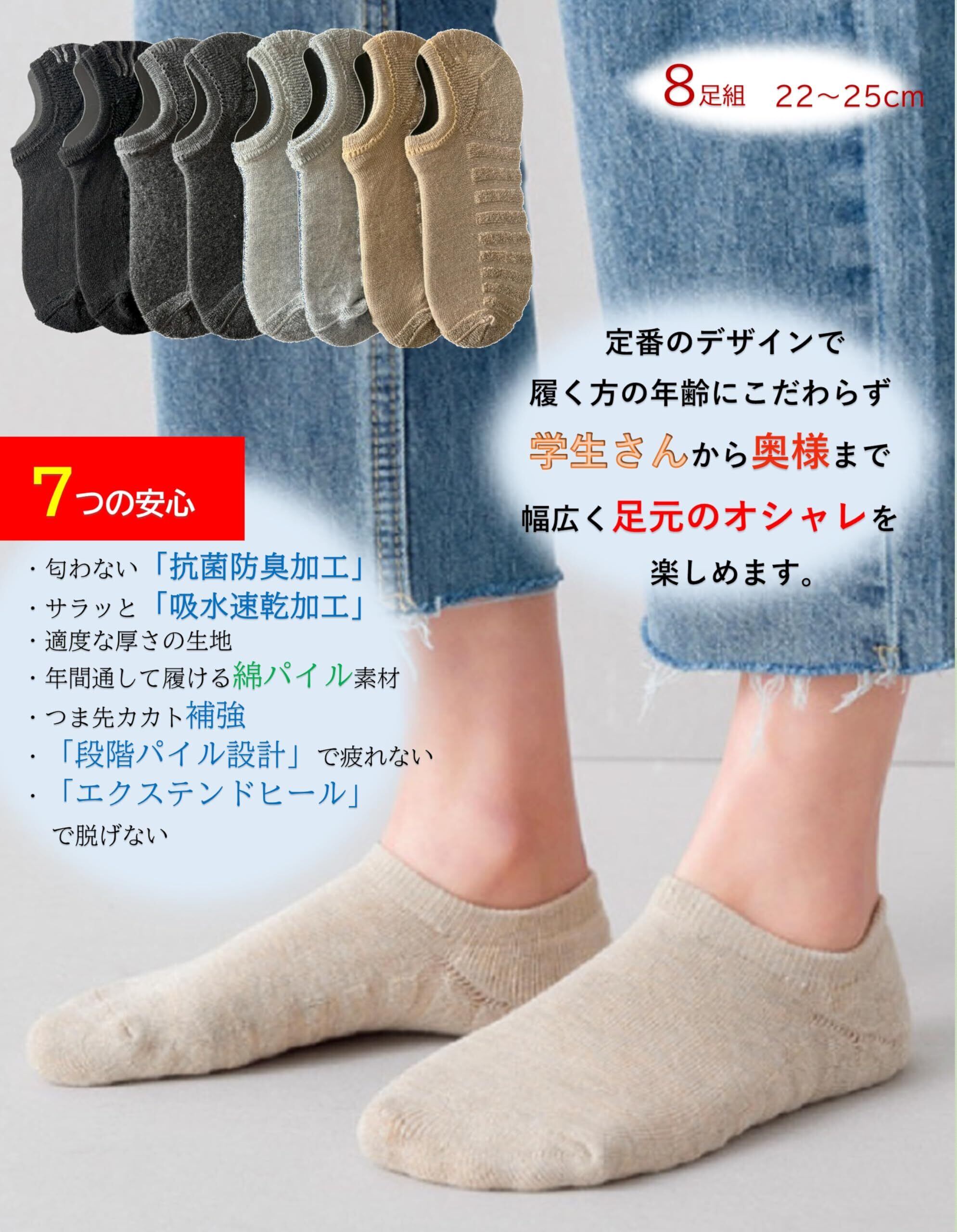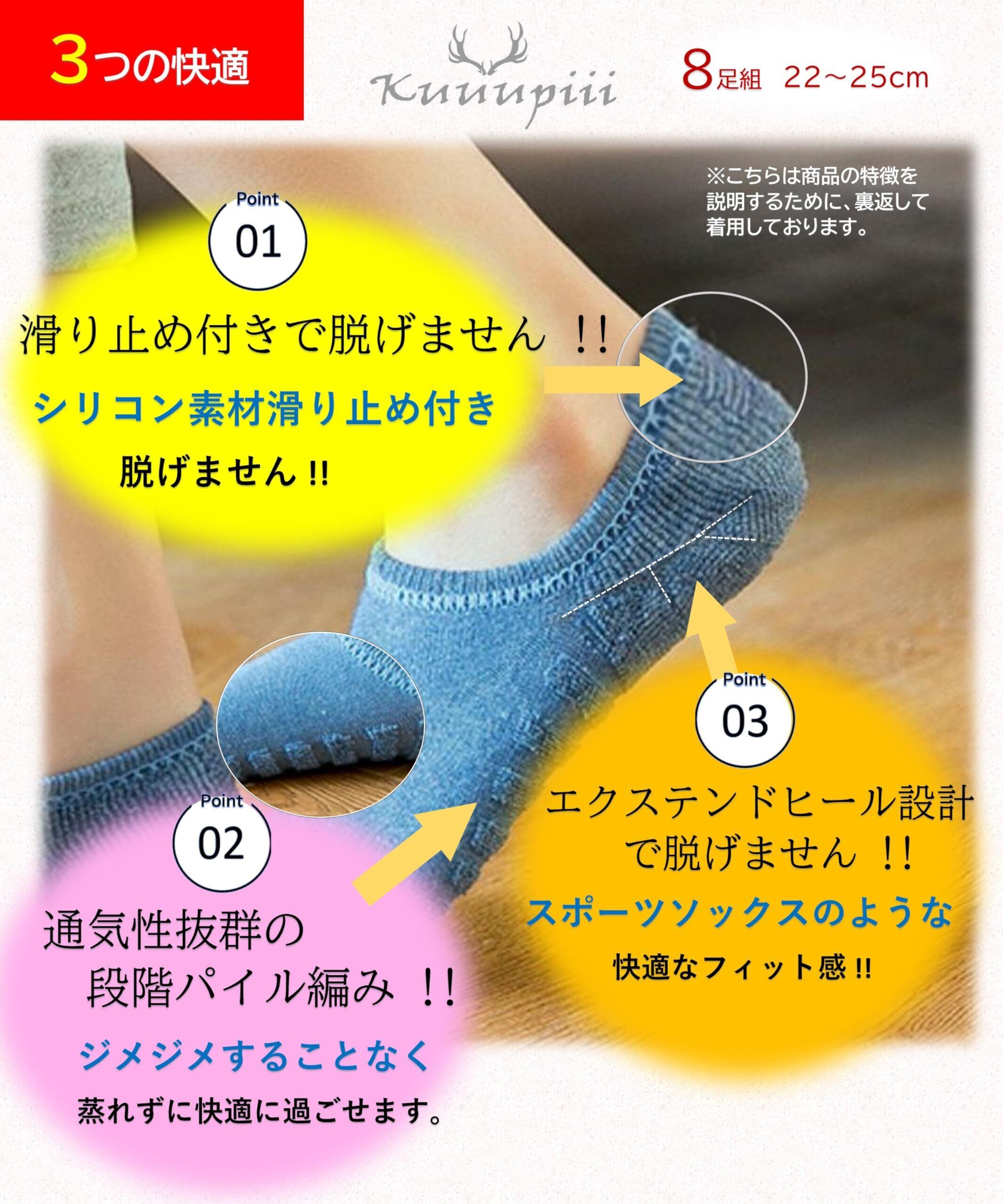 【kuuupiiiさわやか底パイルスニーカーインソックスの機能特徴】 ・足底パイル編み仕様ですが、特に「段階パイル設計」にすることで足裏のムレをなくし衛生的で一日を快適に過ごせます。 ・段階パイル設計でスポーツソックスのようなソフトな履き心地で一日履いても疲れ知らずで過ごせます。 ・特に長時間の立ち仕事や春夏秋の軽ハイキングなどに最適です。