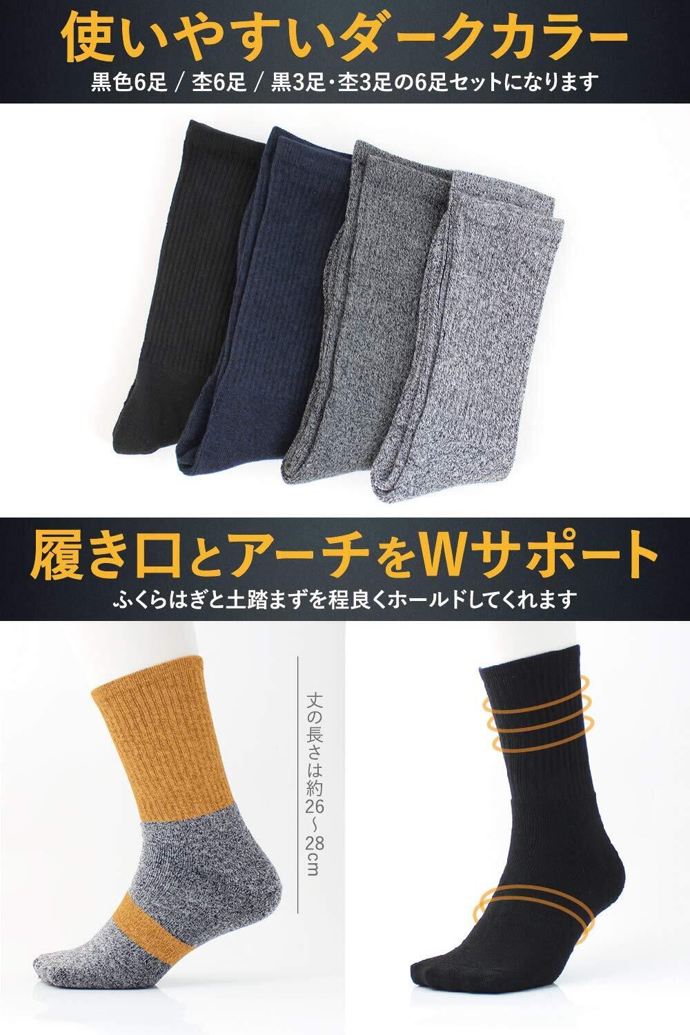 【選べる3パターンの6足組】 サイズは25-27cm(25cm 26cm 27cm)の方に対応。色は、黒色6足 / 杢柄6足 / ミックス6足(黒3足+杢柄3足)の3種類からお選びください。ビジネスシーン、プライベートでも使える定番の冬用靴下。