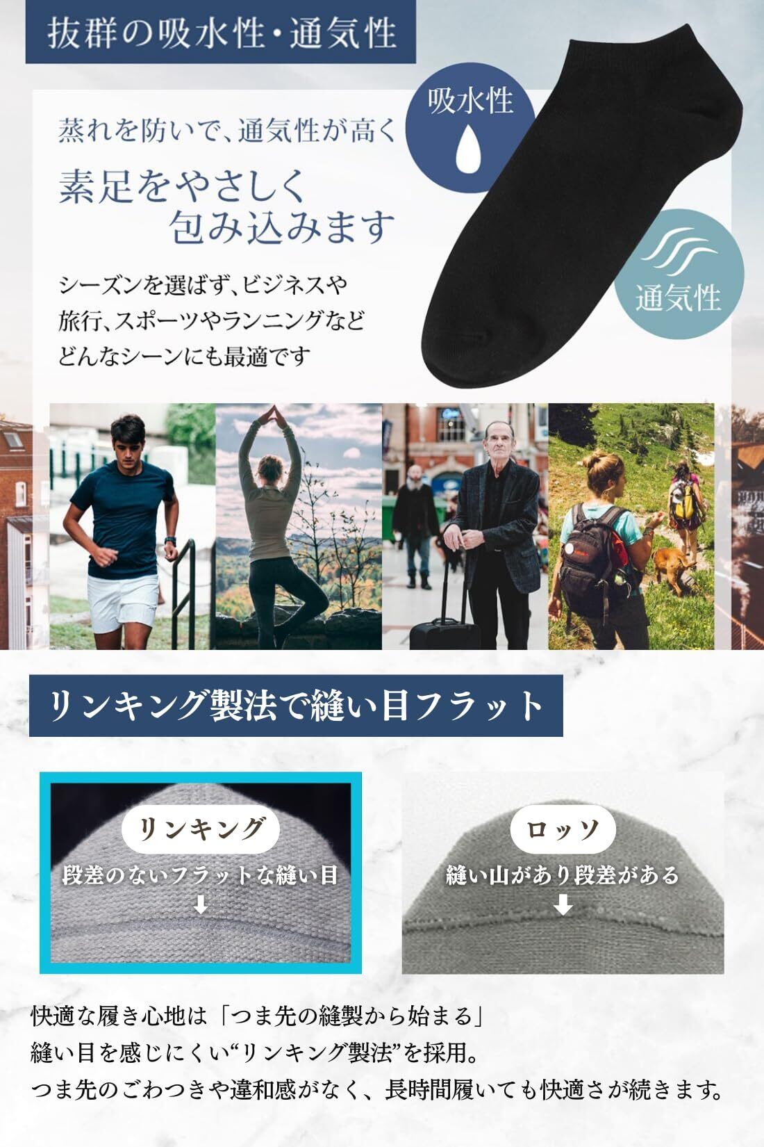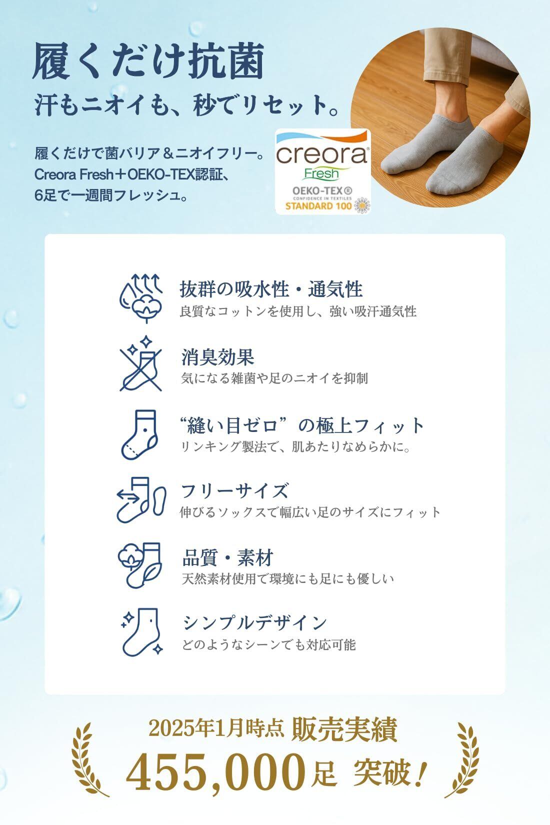 【素材にこだわった表糸綿100%】肌触りと履き心地を両立:表糸は天然素材を厳選しコットン100%、裏糸は足入れのしやすさと履き心地を考え、ポリエステル ポリウレタンを使用 肌触りと履き心地を両立した靴下です 環境に優しい素材を使用しているという証である、世界的認証のOEKO-TEXを取得