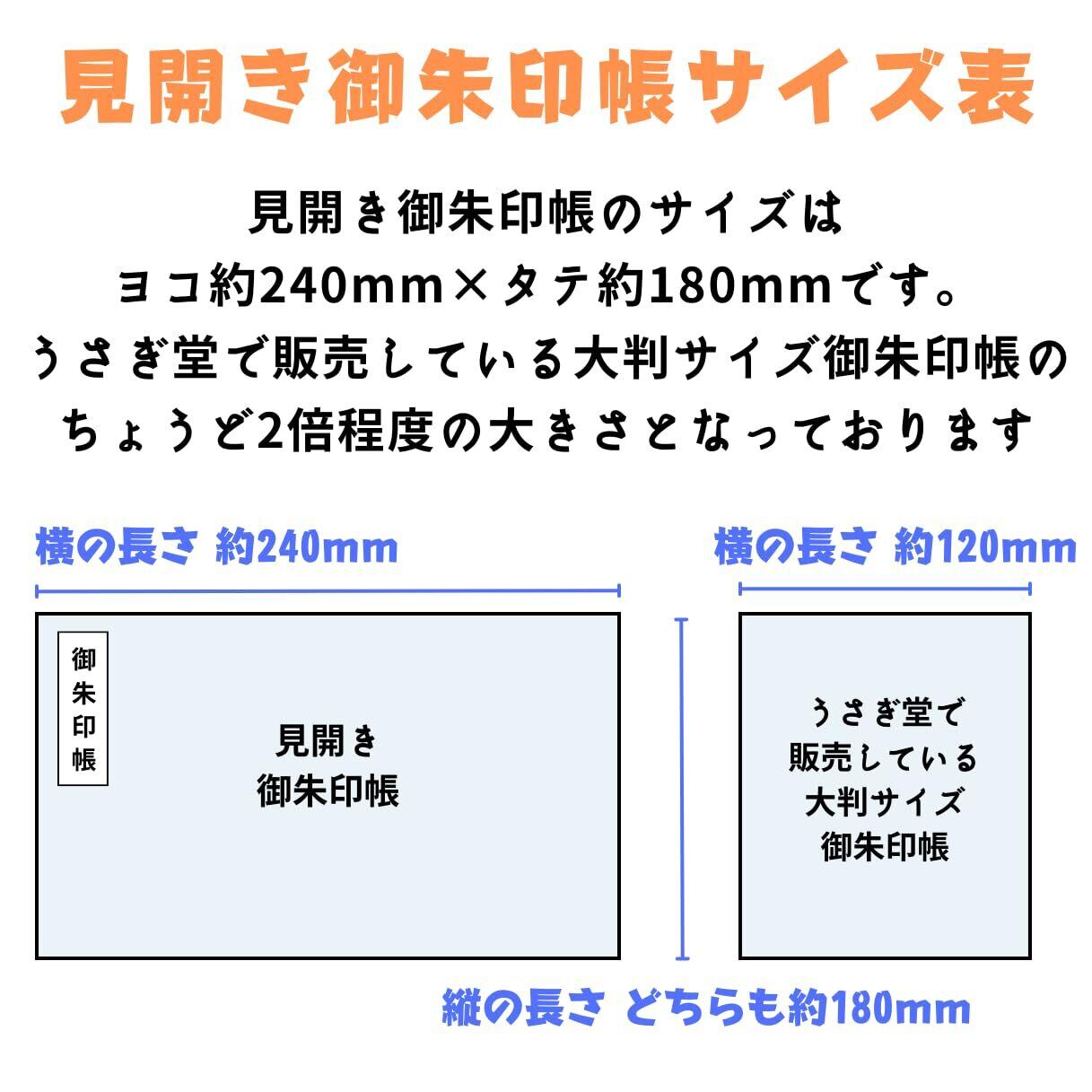 【サイズ】 タテ約18cm ×ヨコ約24cm×厚み 約1.5cm 見開き御朱印もそのまま貼れる使いやすいサイズ! 蛇腹タイプの24ページ(両面使いで48ページ) 【商品ポイント】直書きはもちろん、書き置きタイプや最近多くなっている切り絵タイプの大きな御朱印を折り曲げる事なくそのまま貼れる使いやすい見開き御朱印帳です。いつも持ち歩いている御朱印帳とは別に大きな御朱印専用に見開き御朱印帳をどうぞ【内容】 ◆見開き御朱印帳 本体1冊 ◆手軽に貼れる表題シール2枚(御朱印帳の文字入り1枚・無地1枚)用途に合わせてお好きな物をどうぞ! 【和紙】 綺麗な仕上がりの御朱印帳蛇腹和紙を使用しております。品質や見た目のクオリティ・使い心地は抜群です。大変稀にですが蛇腹本紙に小さな黒い点がある事がございます。原紙の品質基準を満たした和紙ですが製造過程で発生するパルプ繊維や木くず・樹皮・黒点(夾雑物)は和紙製品の一部です。和紙の特徴でもありますので予めご了承下さい。 【その他】 ◆御朱印帳専門店うさぎ堂の商品は全て一冊ずつ手作りで作成されております ◆裁断により表紙柄の出方が一つずつ異なる場合があります ◆出来る限り本当の色合い・生地感を見て頂けるように撮影をしておりますが多少の色の誤差が出る可能性がありますので予めご了承下さい