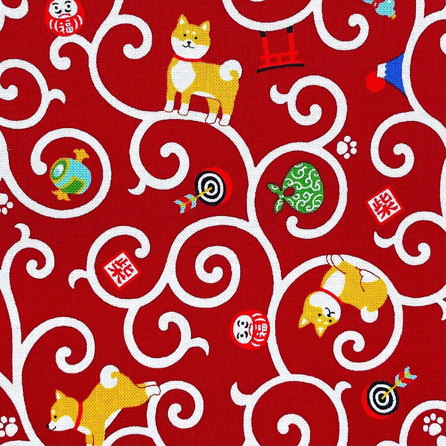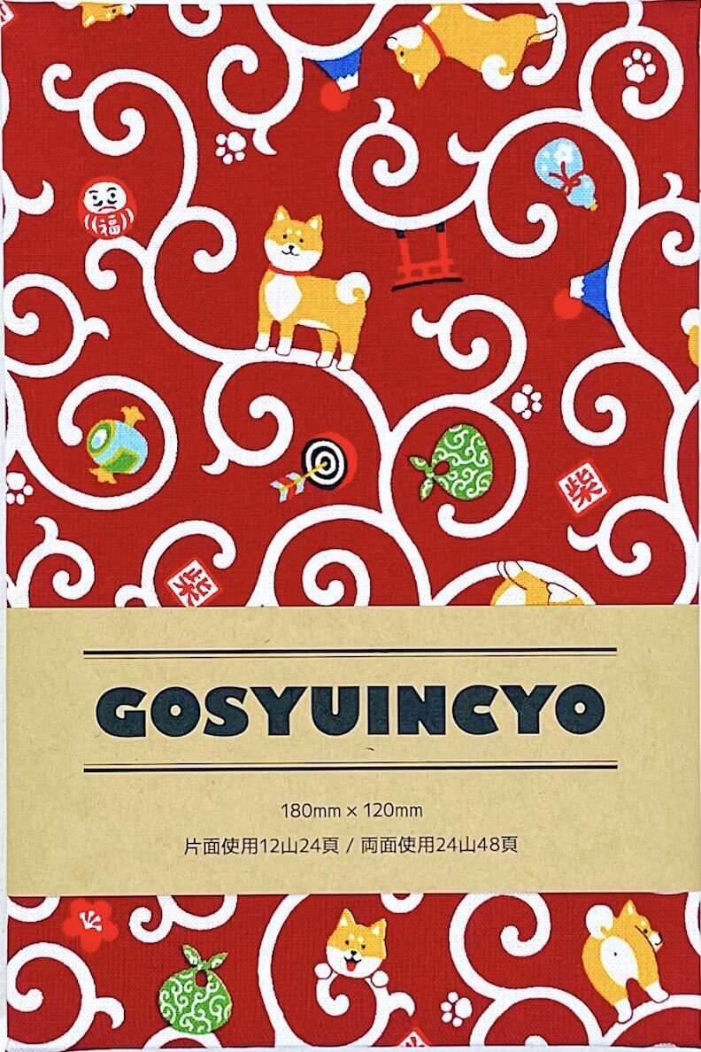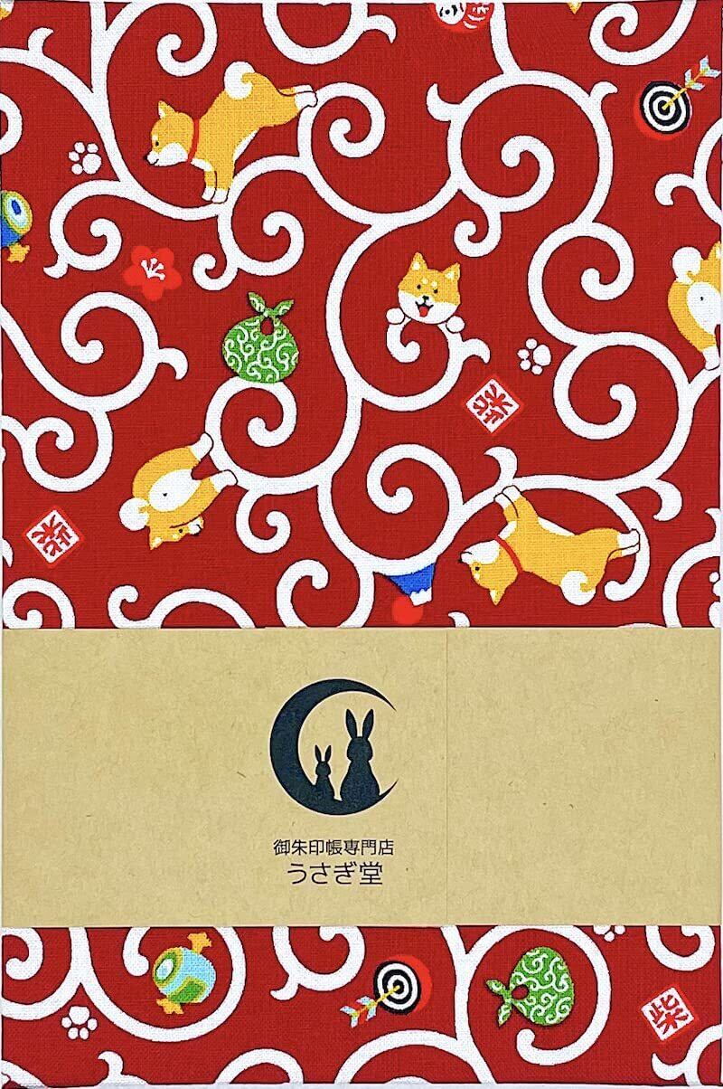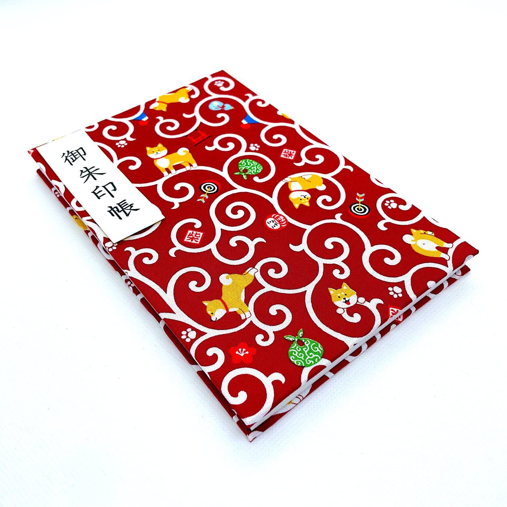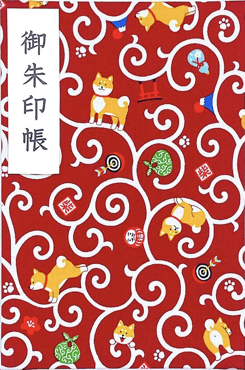 【唐草と柴犬】大判サイズ 御朱印帳・蛇腹タイプ・12山24頁(片面使い)/24山48頁(両面使い) (赤)