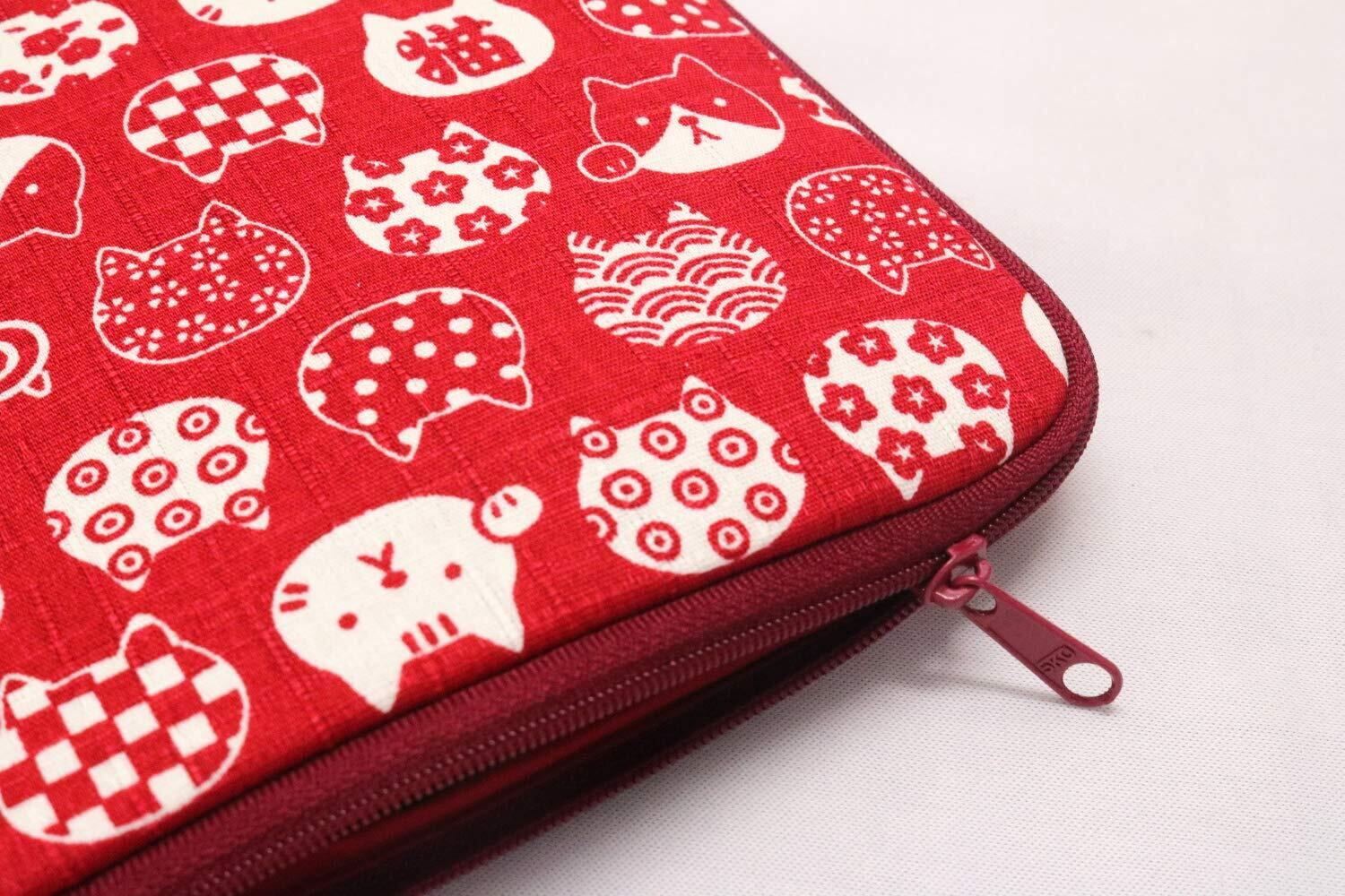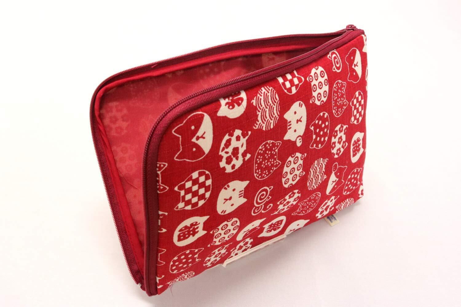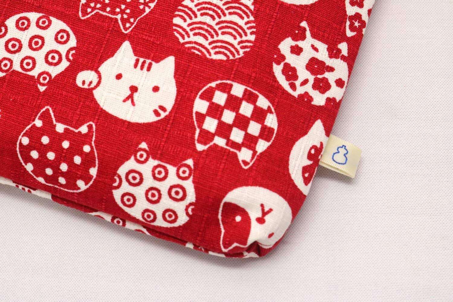 京佑 日本製 綿 ポーチ コスメ メイク 約21×15cm 猫 ねこ L字ファスナー 化粧 旅行 ご朱印帳入れ にゃんこもん 赤 和柄