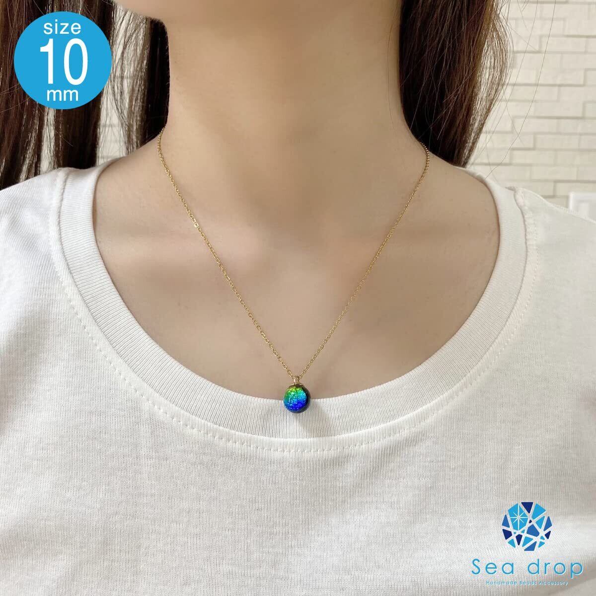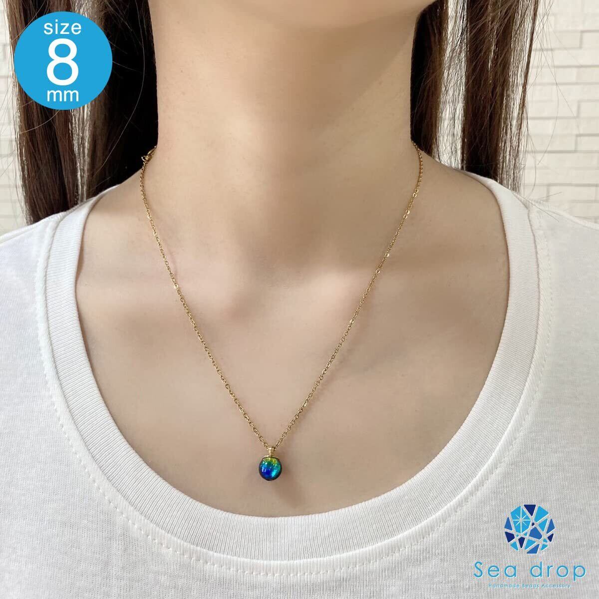 [Sea drop] 光る ホタルガラス ケラママリン 8mm ネックレス 蓄光 ステンレススチール抗アレルギー ゴールドチェーン とんぼ玉 [142nt-g]