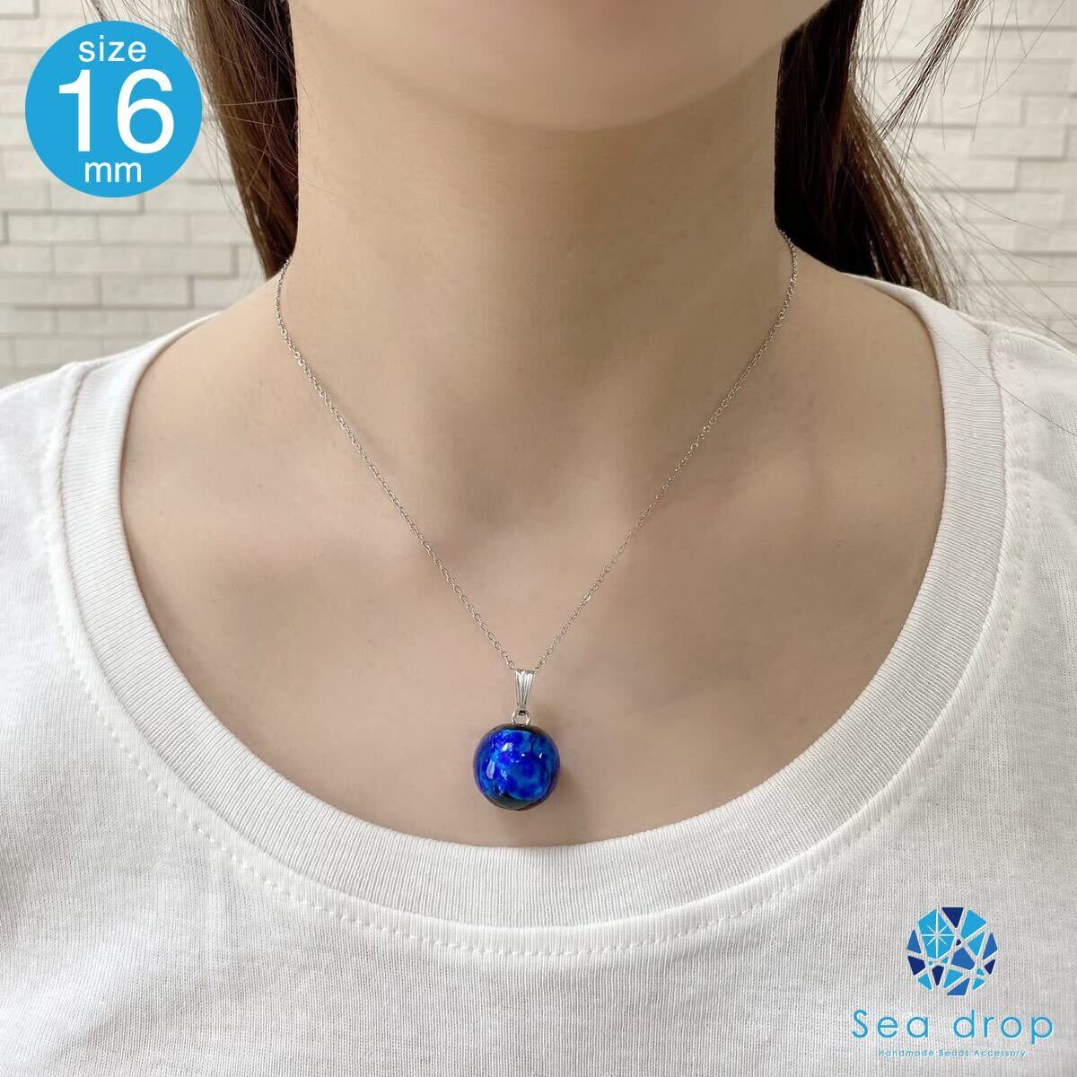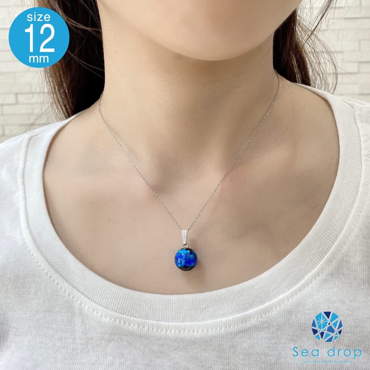 [Sea drop] 光る ホタルガラス ブルー 12mm ネックレス 蓄光 とんぼ玉 ステンレススチール抗アレルギーチェーン レディース シルバー [154nt-s]