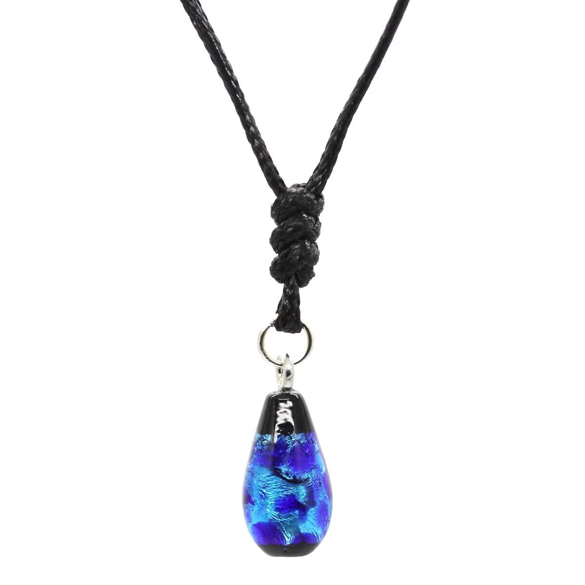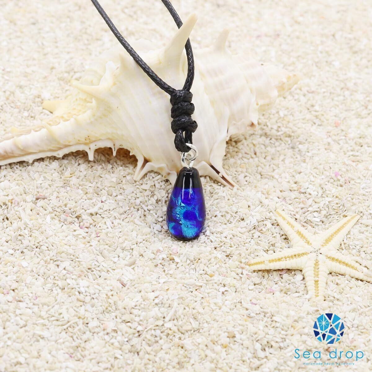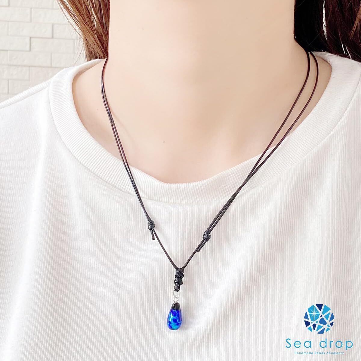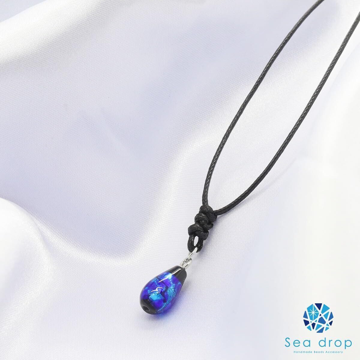 【商品仕様】 チェーン:丸紐ネックレスコード 33-86cm(調節可能なフリーサイズ)(アジャスター式) ホタルガラス:ドロップ型 約15mm×8mm 蓄光タイプ (ブルー)