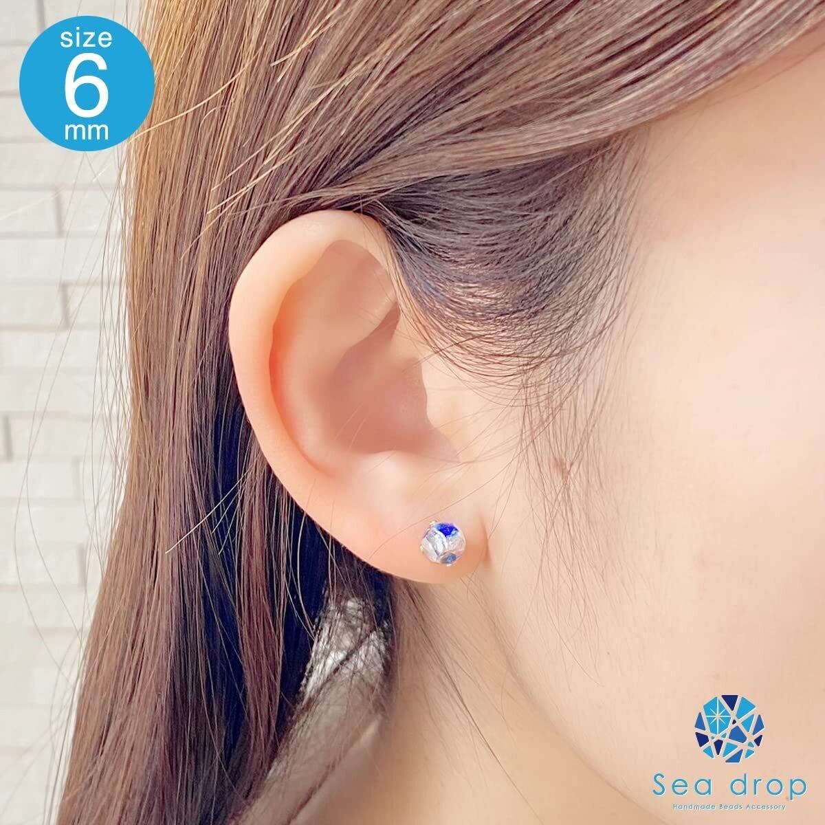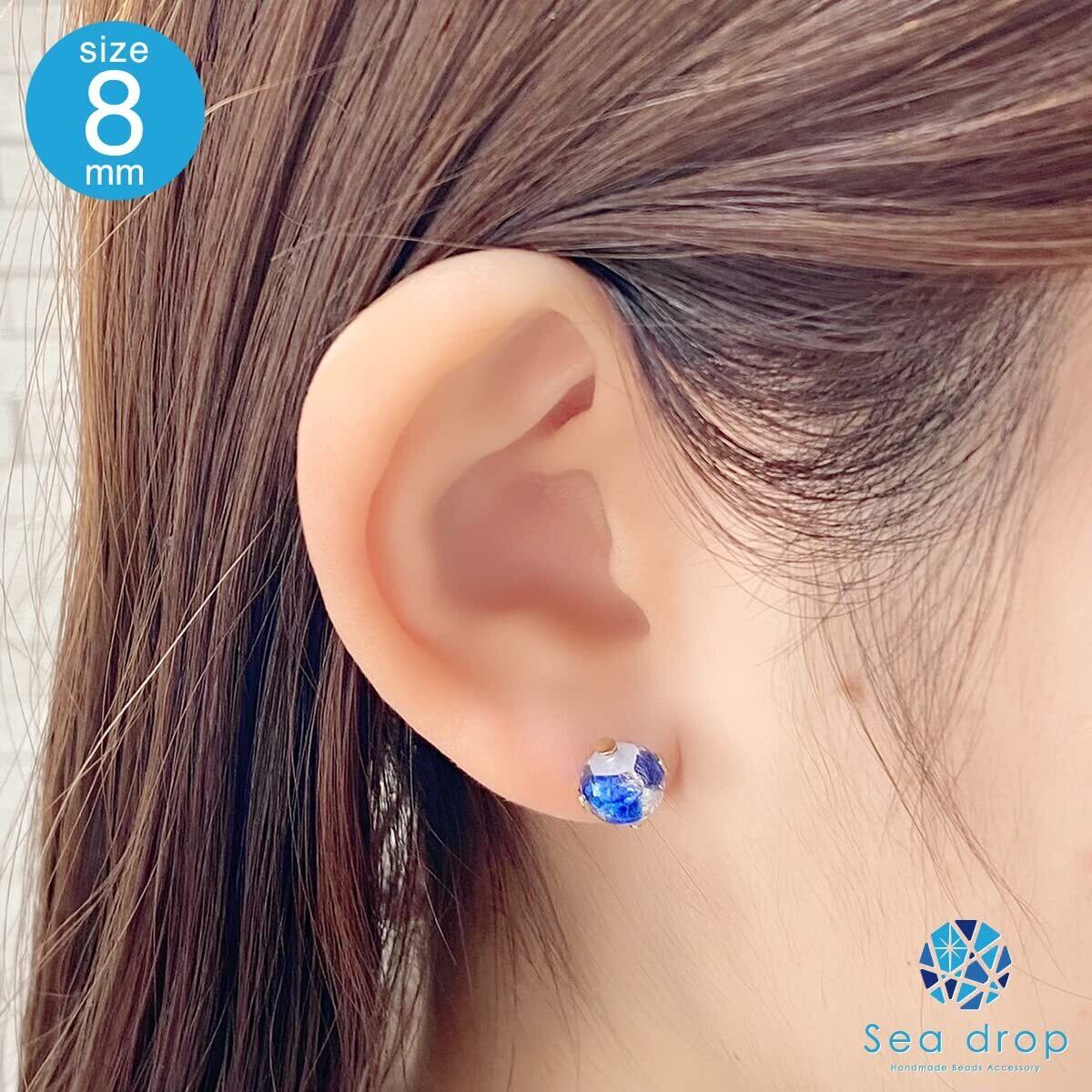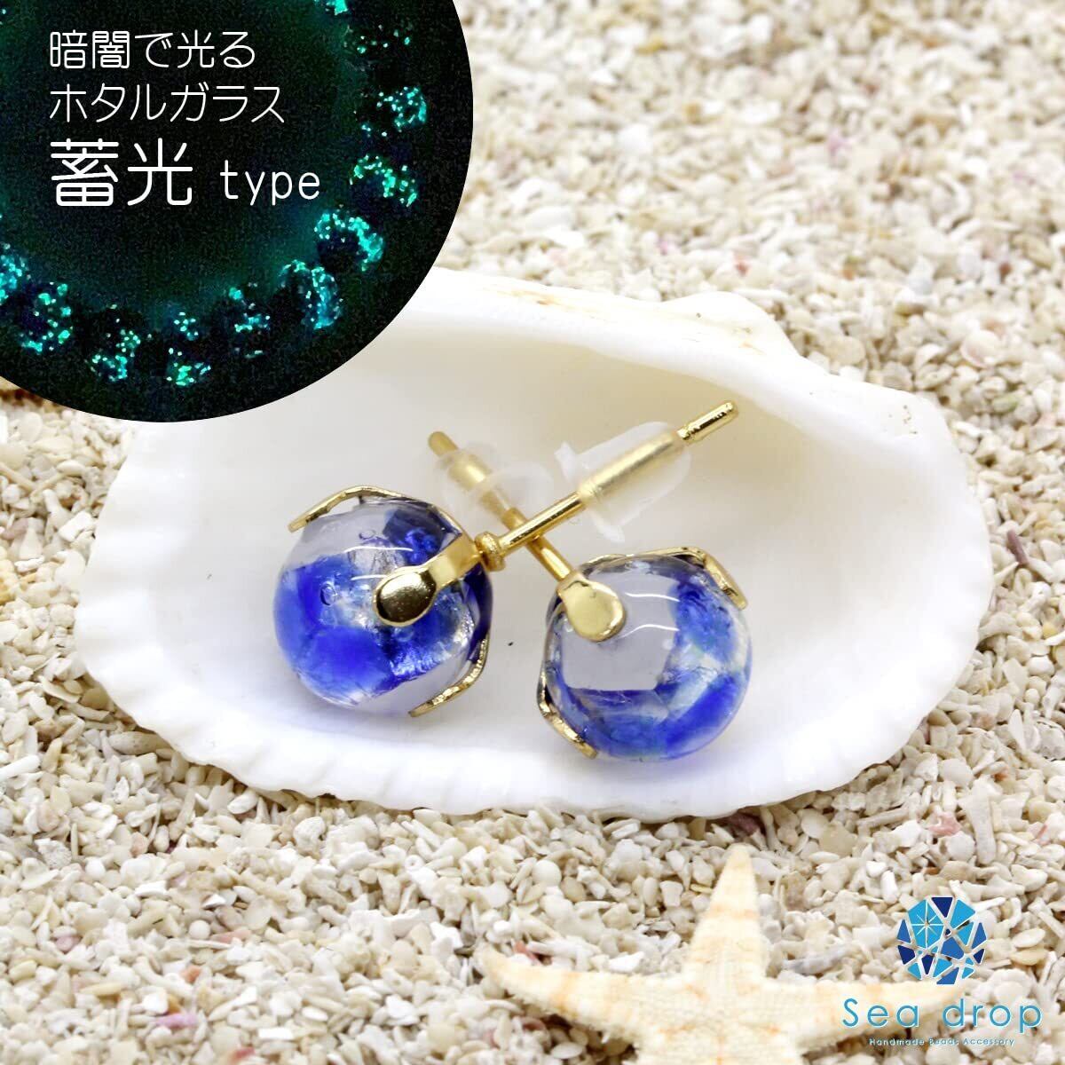 Sea drop 光る ホタルガラス スタッドピアス ホワイト×ブルー 蓄光 レディース ステンレス 金属アレルギー対応 両耳用 ゴールドカラー [174et-g]