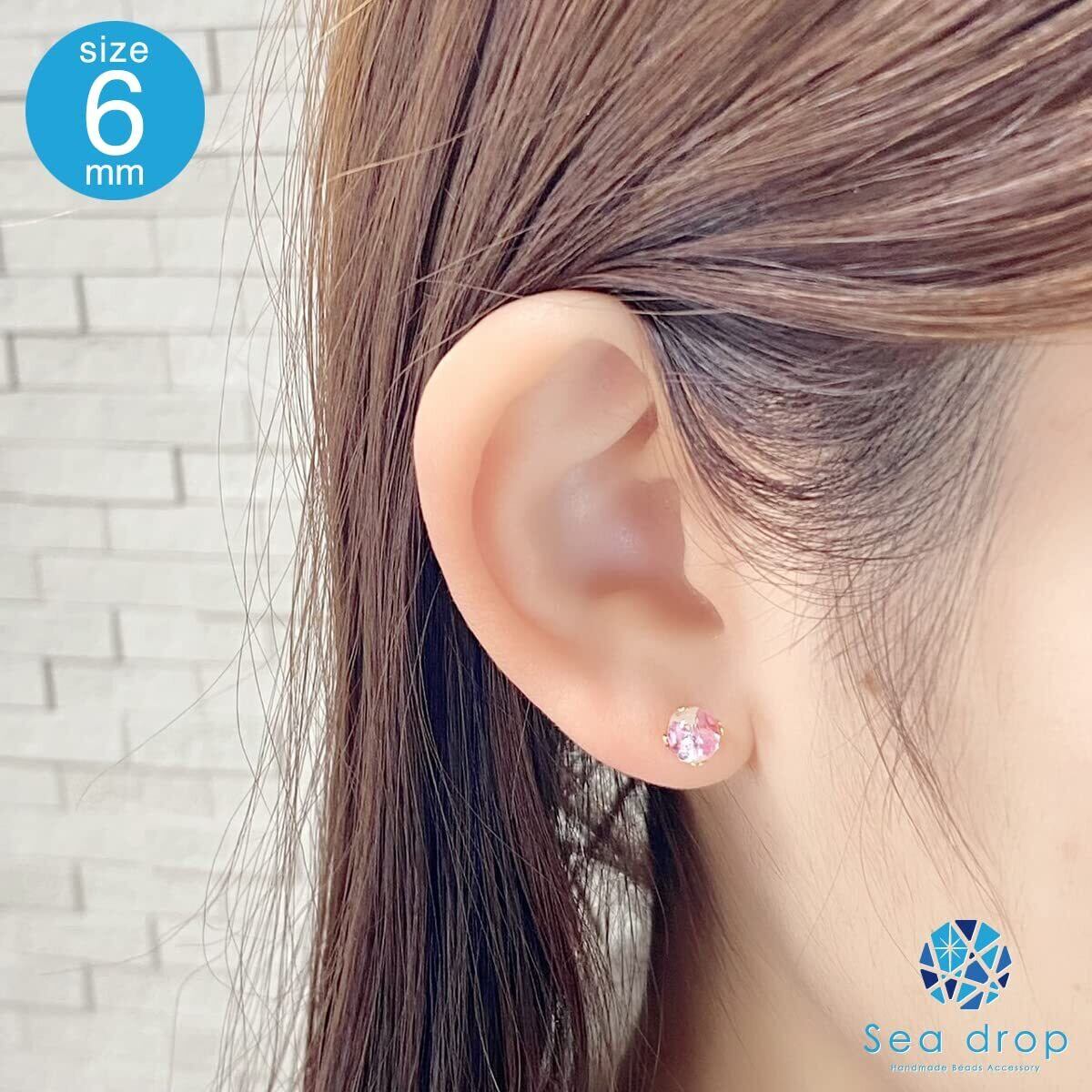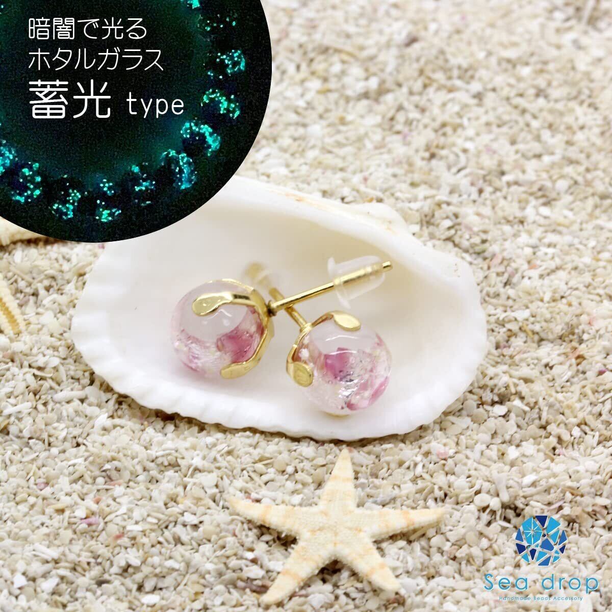 Sea drop 光る ホタルガラス スタッドピアス ホワイト×ピンク 蓄光 レディース ステンレス 金属アレルギー対応 両耳用 ゴールドカラー [175et-g]