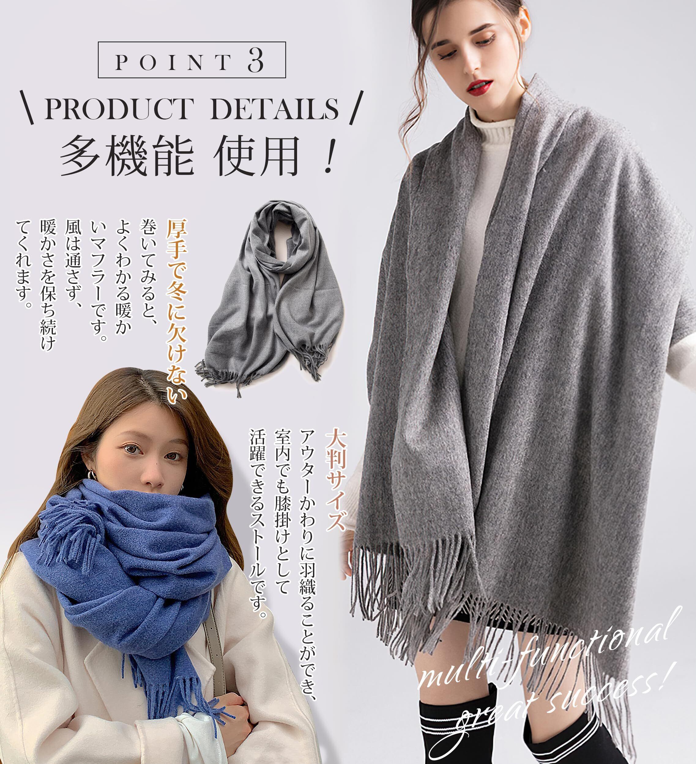 【暖かさとファッションの完璧な融合】 マフラーはゆったりとしたサイズなので、寒い日でも完璧な保温効果を提供します。贅沢な包み込まれる感覚を楽しみながら、厳しい寒さからもしっかり守るマフラーです。レディース マフラーは、洗練されたデザインと優れた保温性を兼ね備えた究極のファッションアイテムです。マフラー レディースはどんなコーディネートにも簡単に合わせることができ、寒さを防ぎつつスタイリッシュに過ごすことができます。日常使いでも特別なシーンでも、 大判ストールが快適さと優雅さをお届けします。