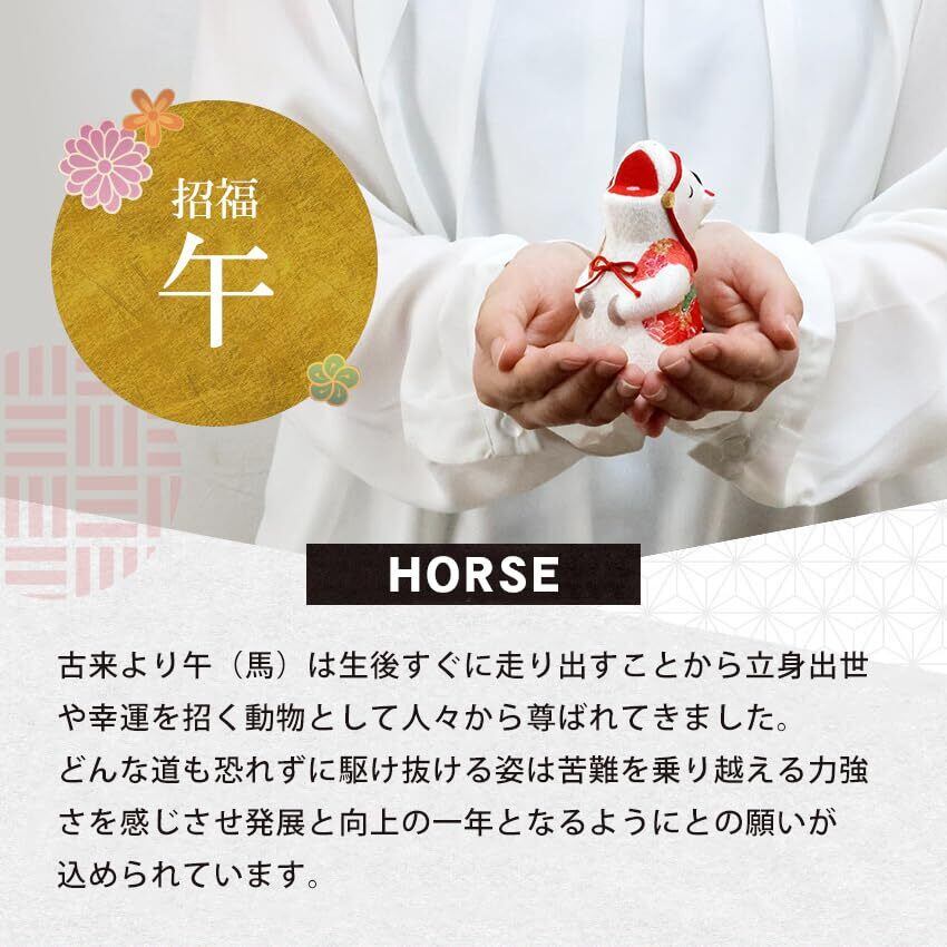 古来より午(馬)は生後すぐに走り出すことから立身出世や幸運を招く動物として人々から尊ばれてきました。どんな道も恐れずに駆け抜ける姿は苦難を乗り越える力強さを感じさせ発展と向上の一年となるようにとの願いが込められています。