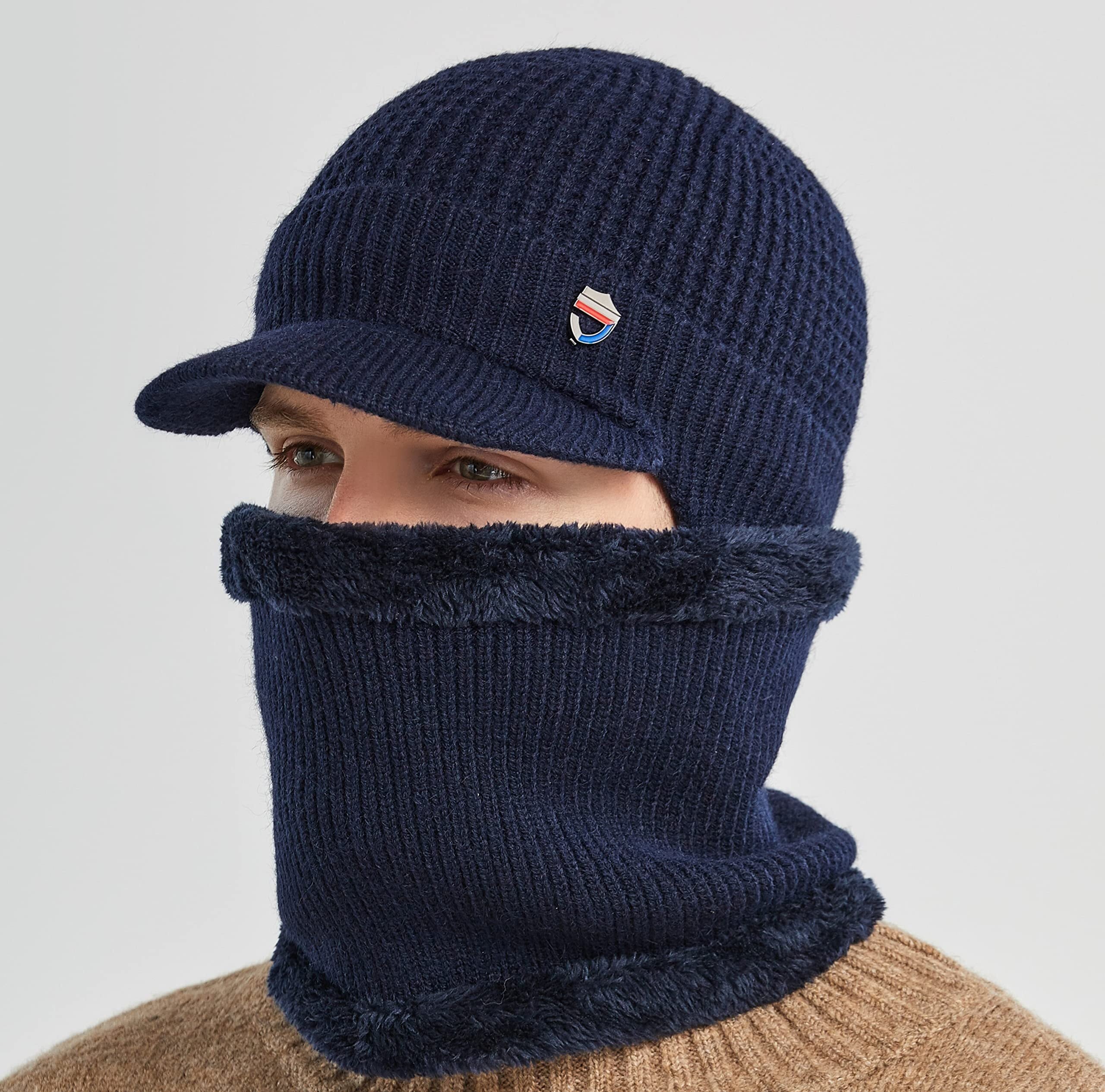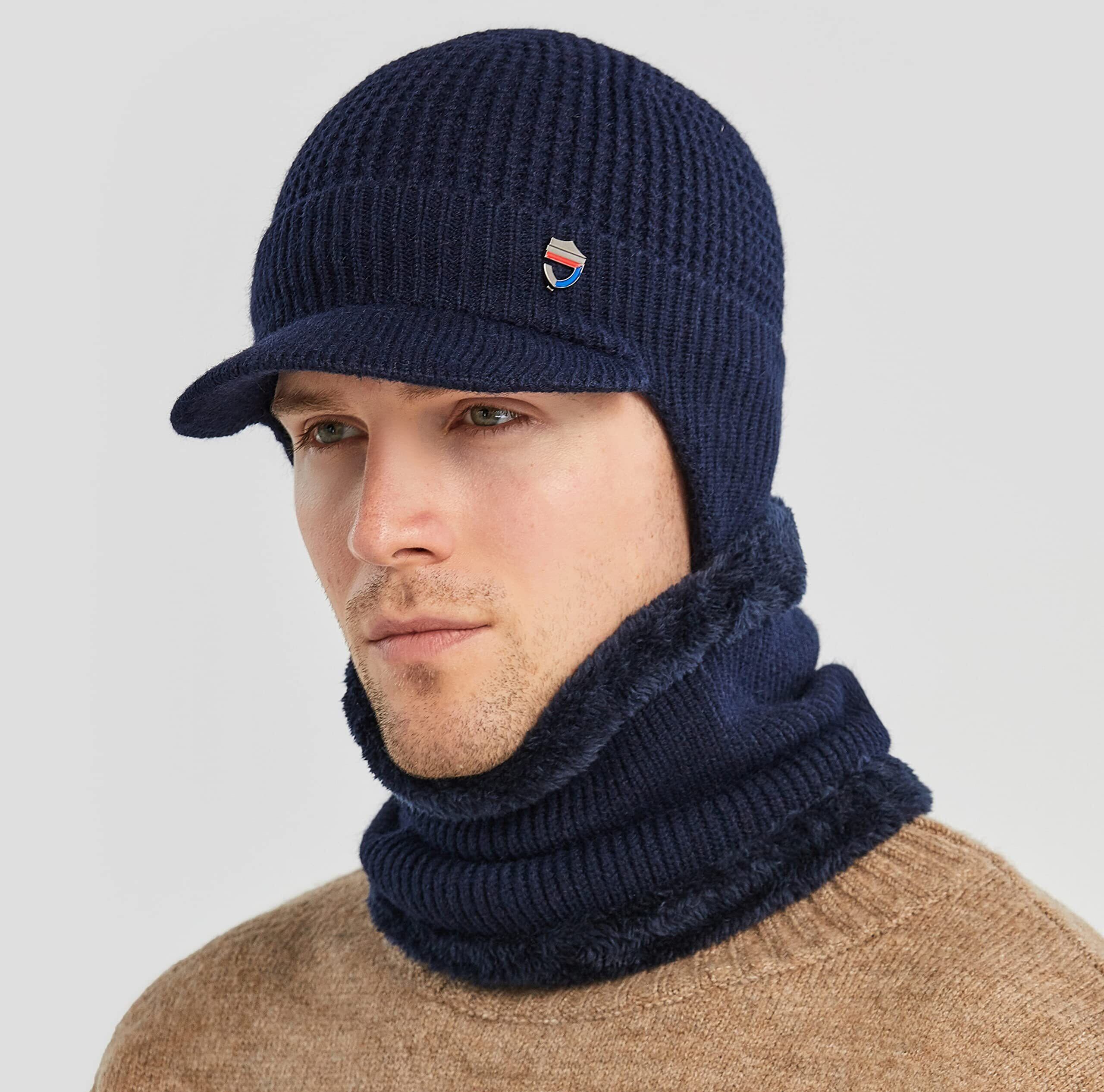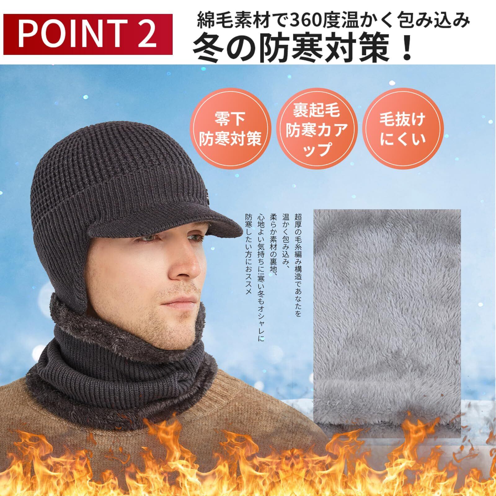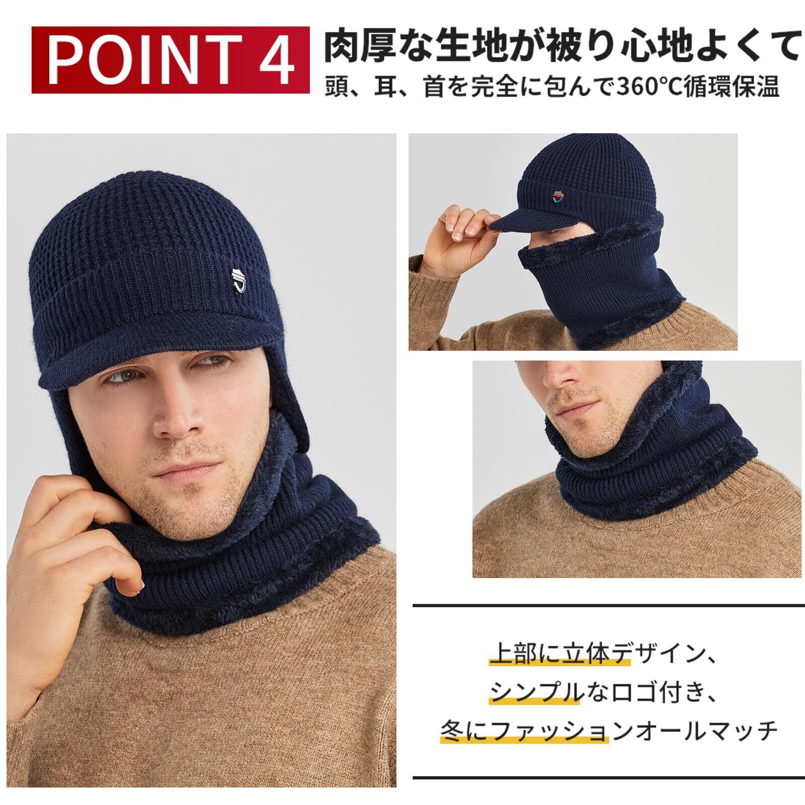 [LeafIn] ニット帽 ネックウォーマー 2点セット 耳当て 帽子 防寒 防風 アウトドア用 スポーツ 釣り 自転車 裏起毛 寒さ対策 伸縮性 メンズ ツバ付き キャップ 厚手 柔らかい 登山 通勤 56-60cm 9116