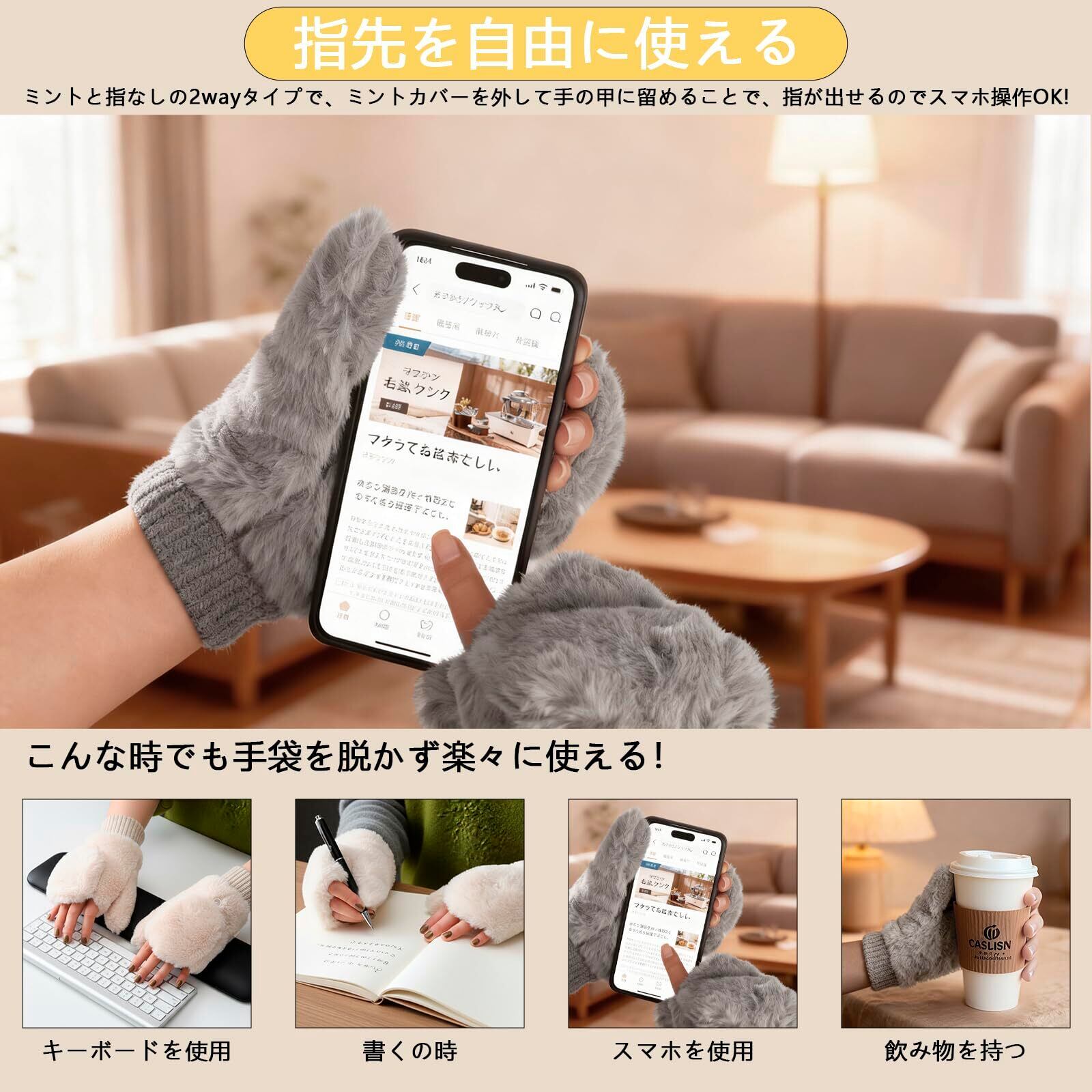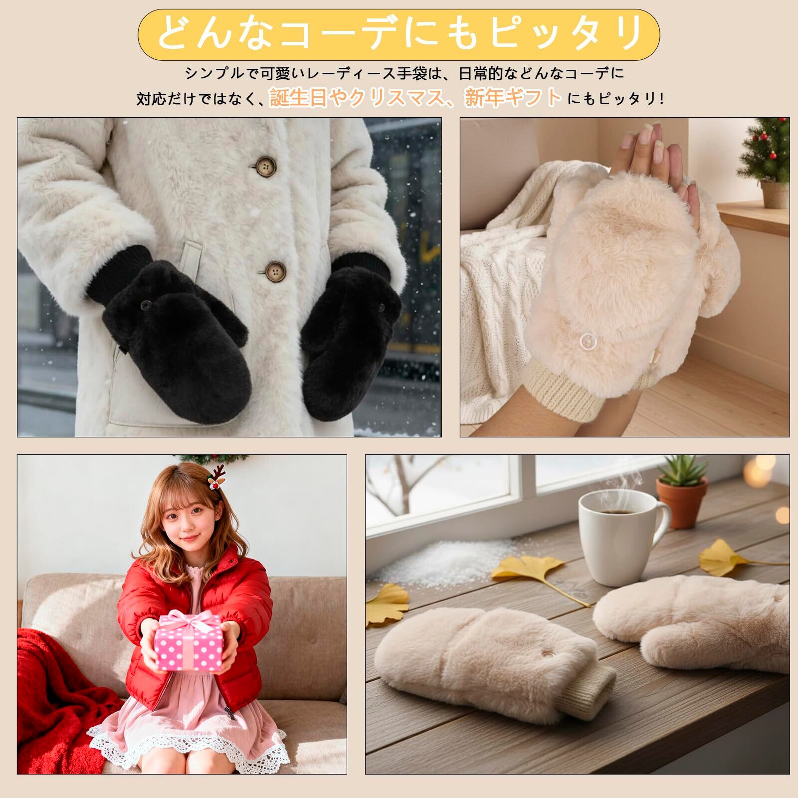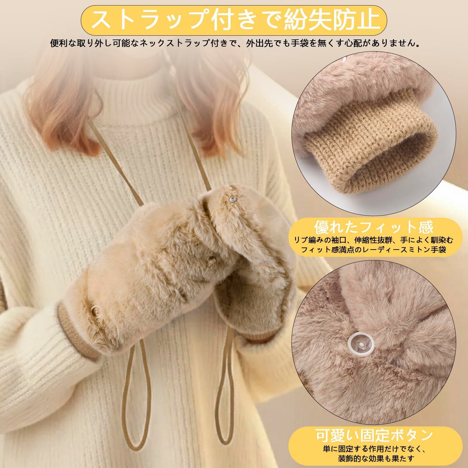 [Qhoculi] ミトン 手袋 レディース 冬 厚手【2WAY変換】 指なし手袋 可愛い もこもこ フリップキャップ 付き 半指 全指 切り替え 掛け紐付き 仿うさぎ毛 防寒 暖かい 自転車 通勤 スキー アウトドア クリスマスプレゼント