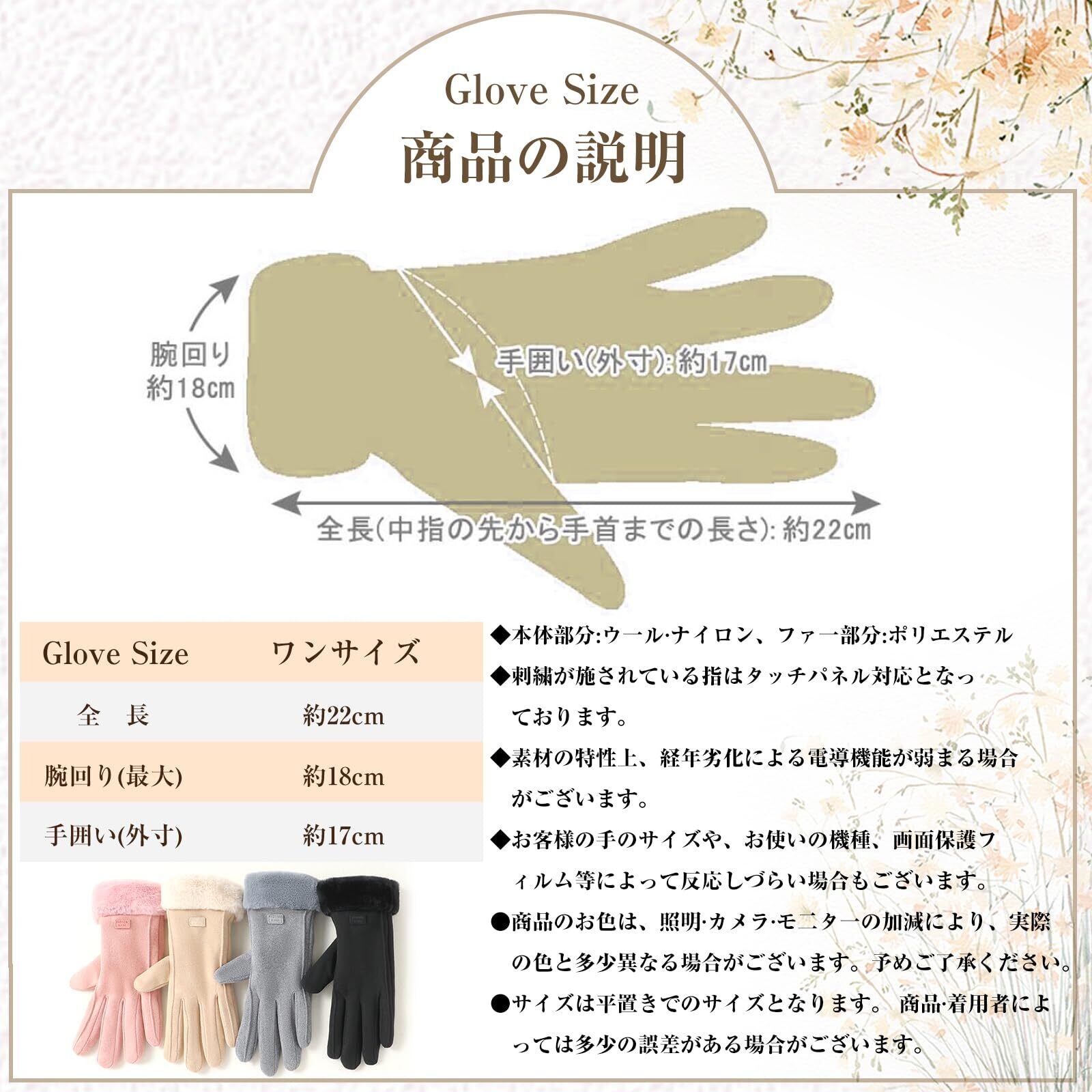 【超柔らかい肌触り】フリーサイズ:全長約22cm。中指長は約8cmです。重量:約72g。素材:超柔らかいウール・ナイロン(本体部分)、ポリエステル(ファー部分)。手の首がタグ付けた飾りのデザインです。表地はやや毛羽立ち感のある温かみのある素材を採用しました。毛玉ができにくい加工を施してあり、綺麗な表面感が長持ちします。●サイズは平置きで測定しております。商品・着用者によっては多少の誤差がある場合がございます。