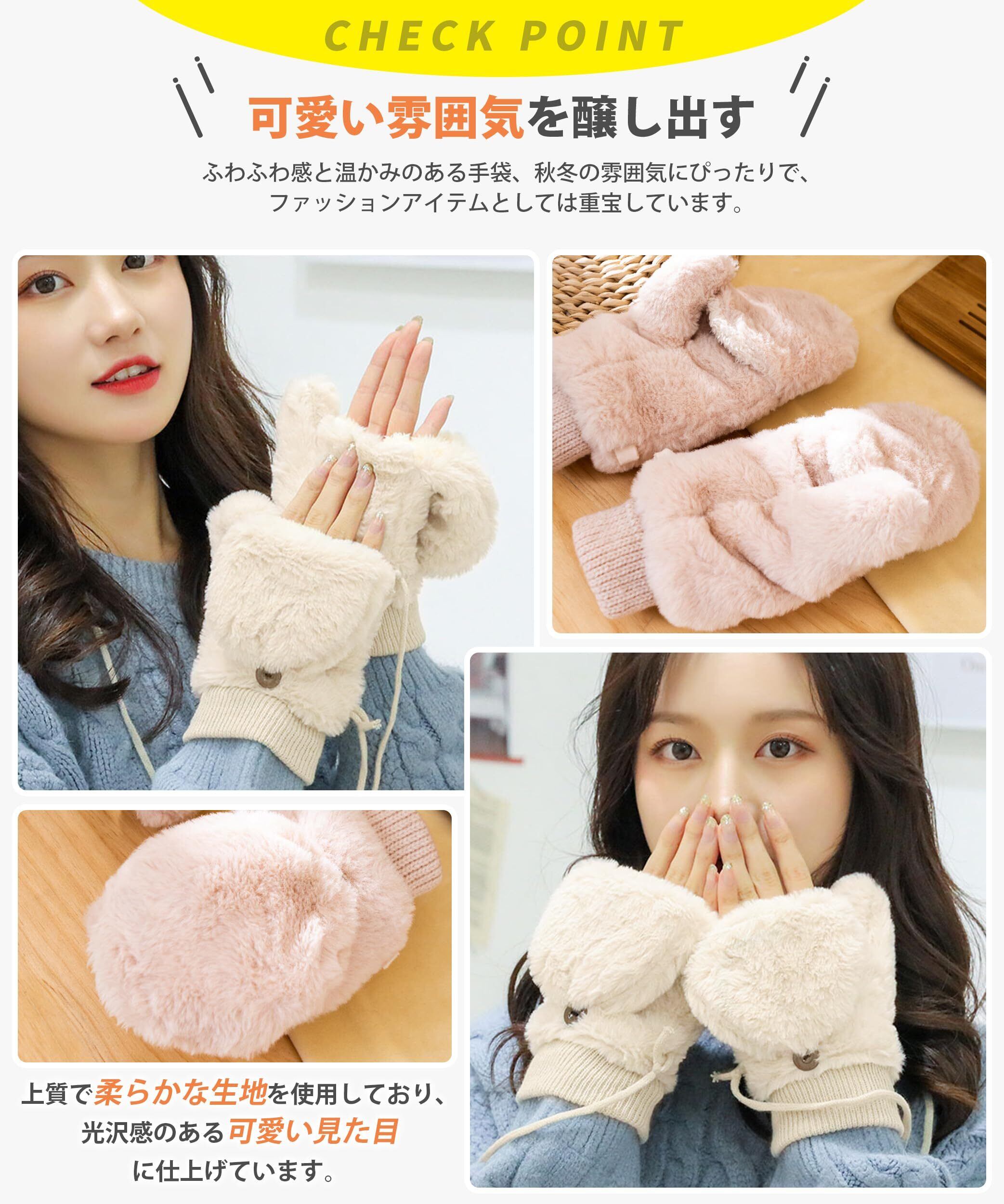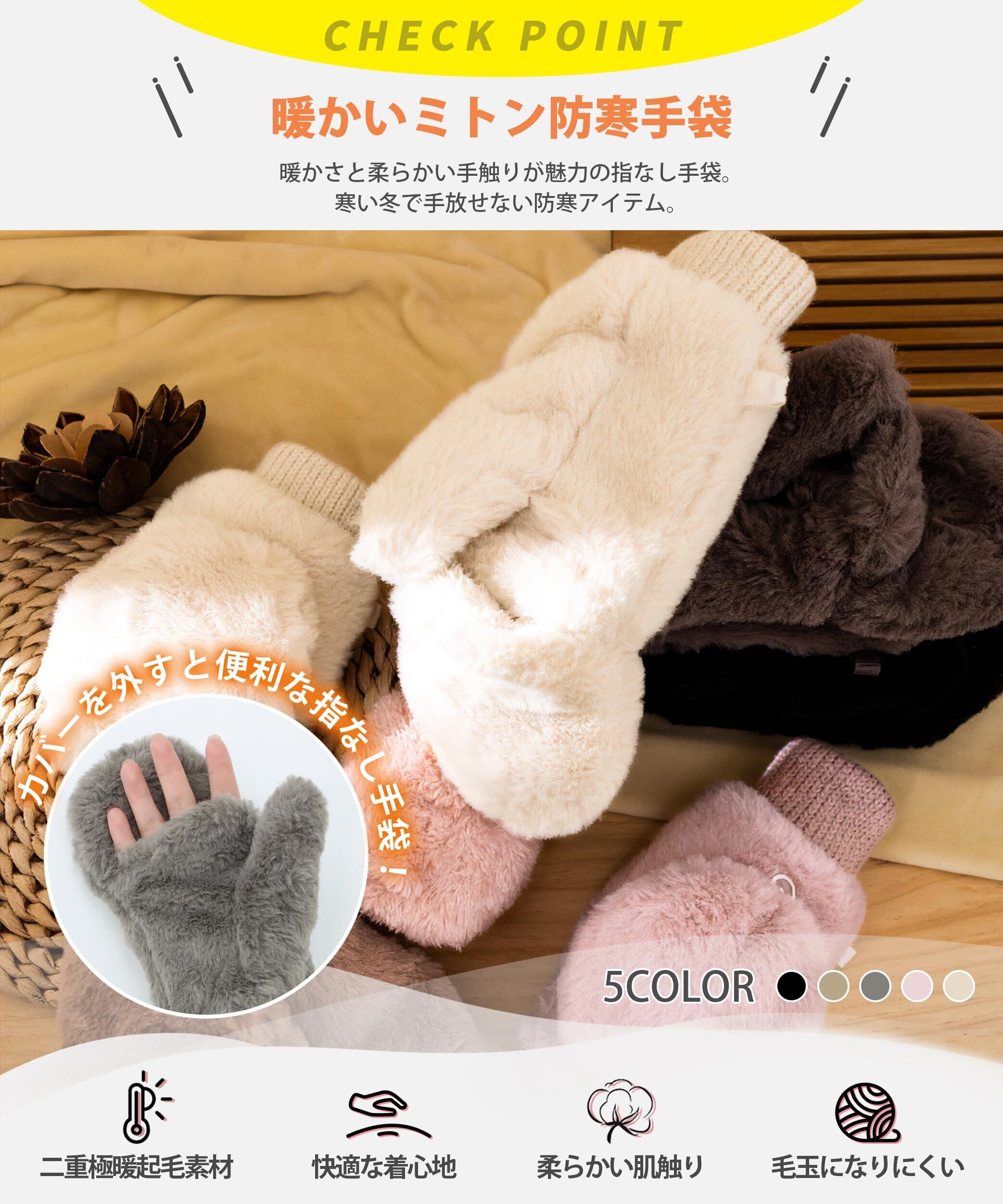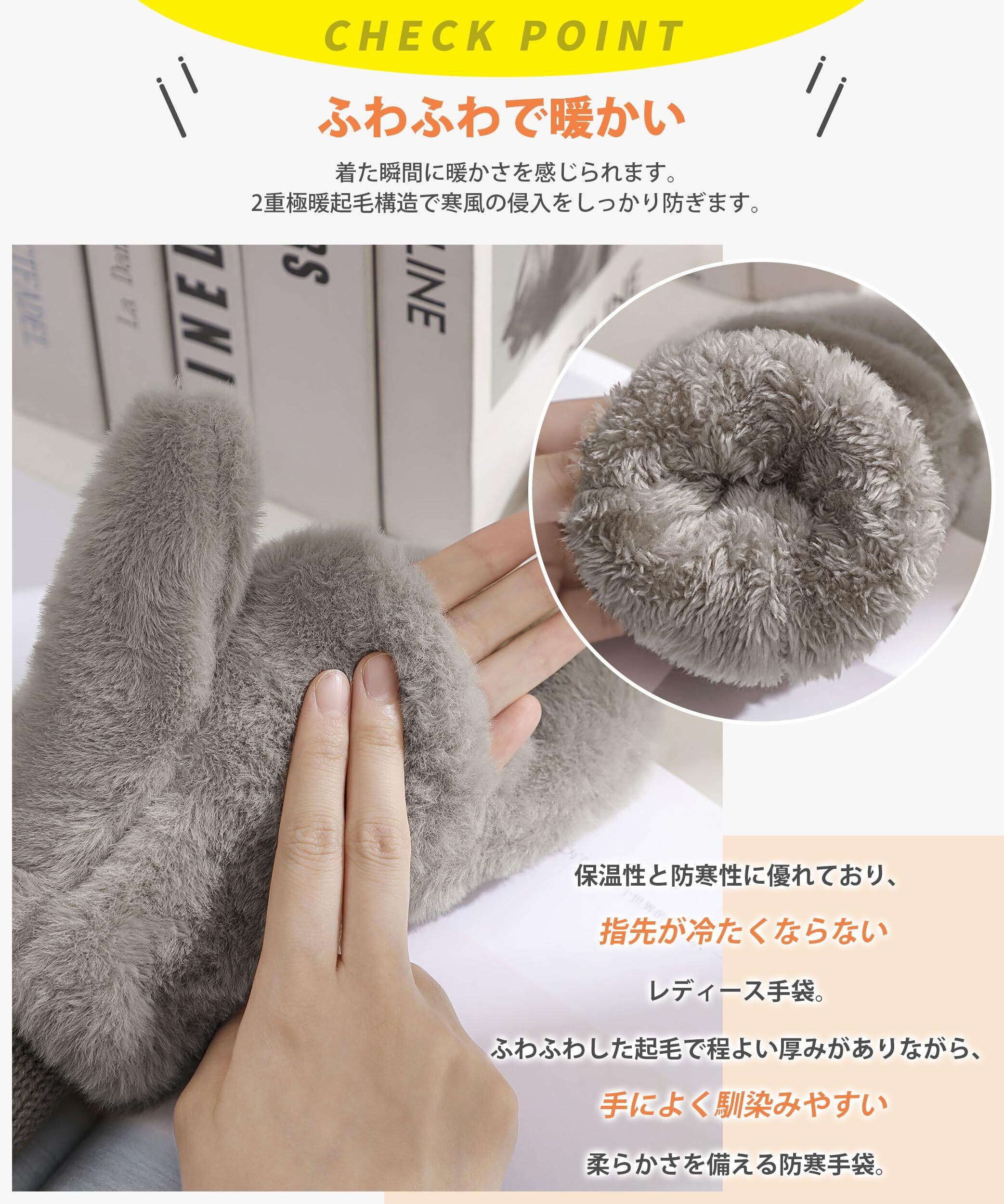 【上質な肌触り】暖かさと柔らかい手触りが魅力の防寒手袋。ふんわりと柔らかな質感の起毛に仕上がり、やさしく手を包み込んでくれ、快適な着心地を楽しめるレディース手袋。もこもこした見た目から暖かな肌触りを感じ、優しい色合いで柔らかい雰囲気も演出できる防寒手袋。保温性を保ちつつ、指先の操作性も高めた指なし手袋。