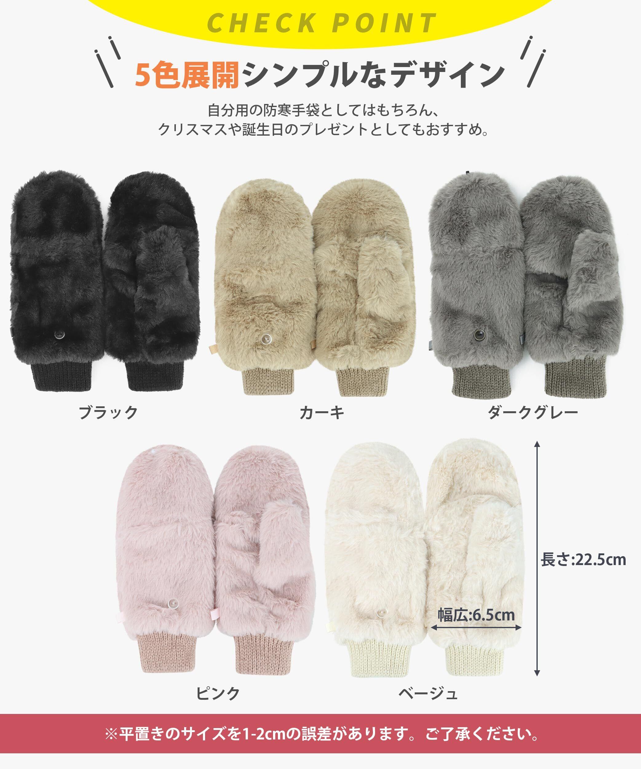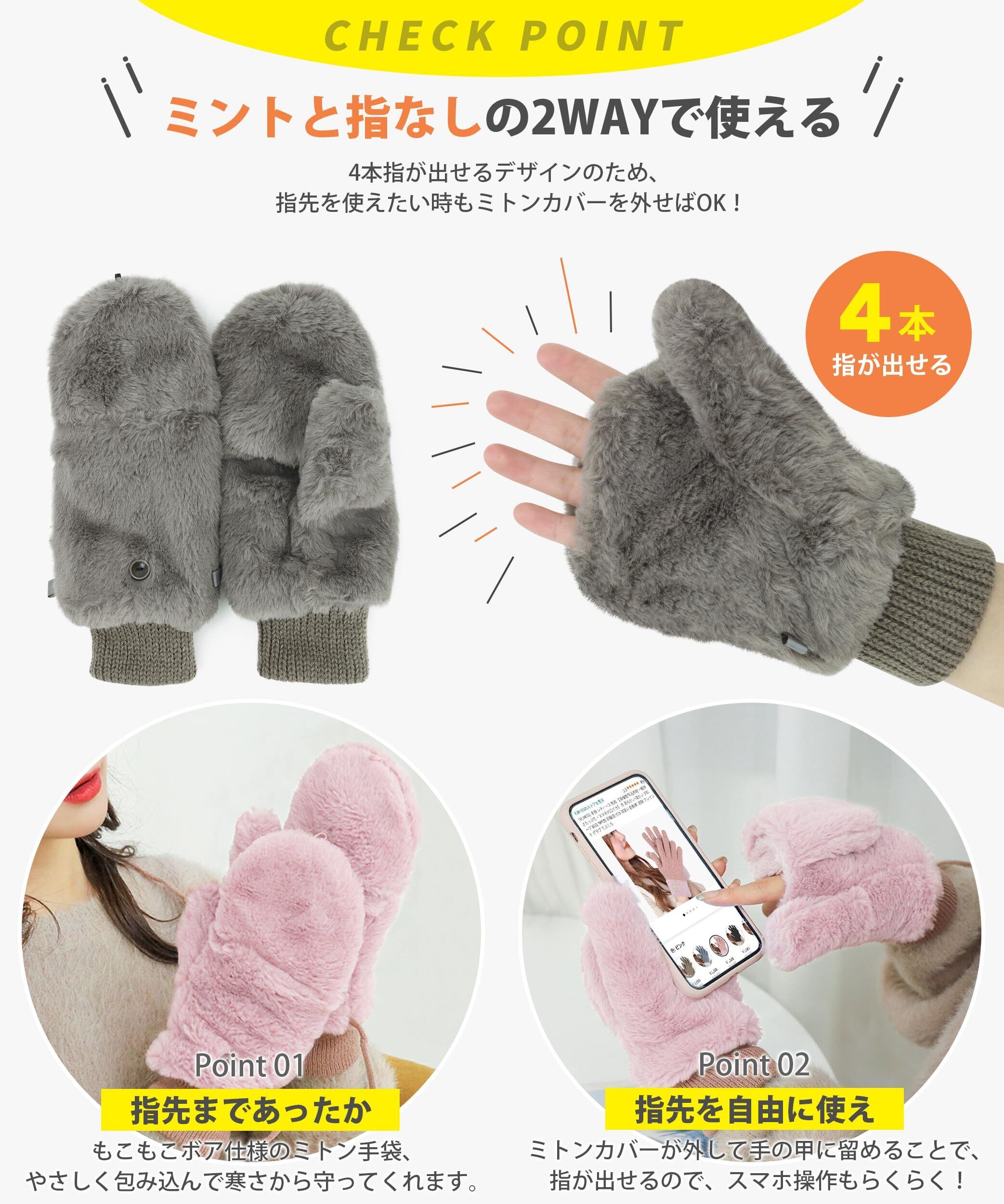 【2WAY仕様】便利な2WAY仕様のレディース防寒手袋。手首から指先まで暖かくカバーしてくれるポカポカ手袋だけでなく、ミトンタイプで4本指が出せて指先の操作性に優れていた指なし手袋。指先が自由に動かしやすい防寒手袋。指の部分だけ脱いでスマホの操作ができる指なし手袋として、その他の細かい作業に邪魔になりません。