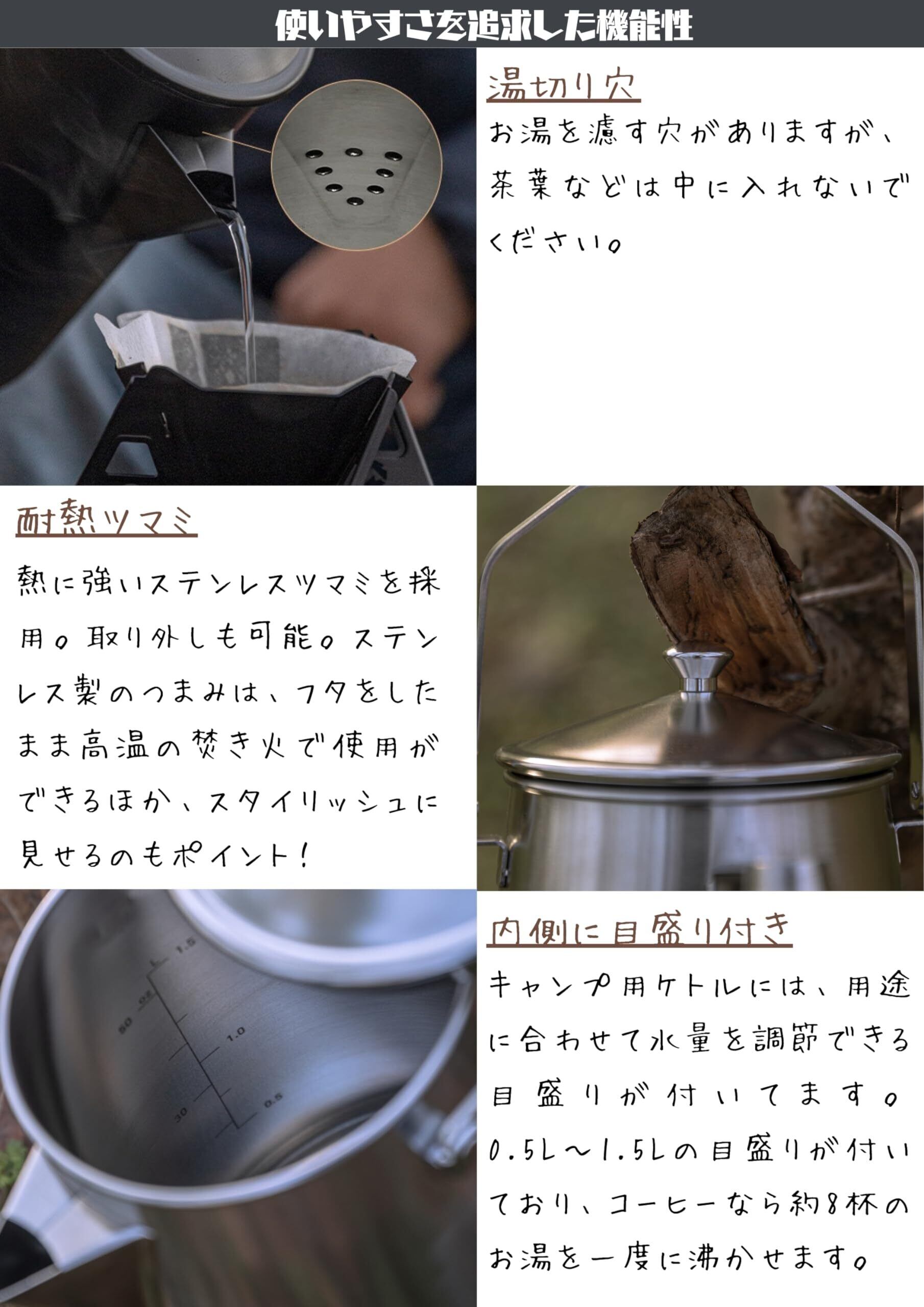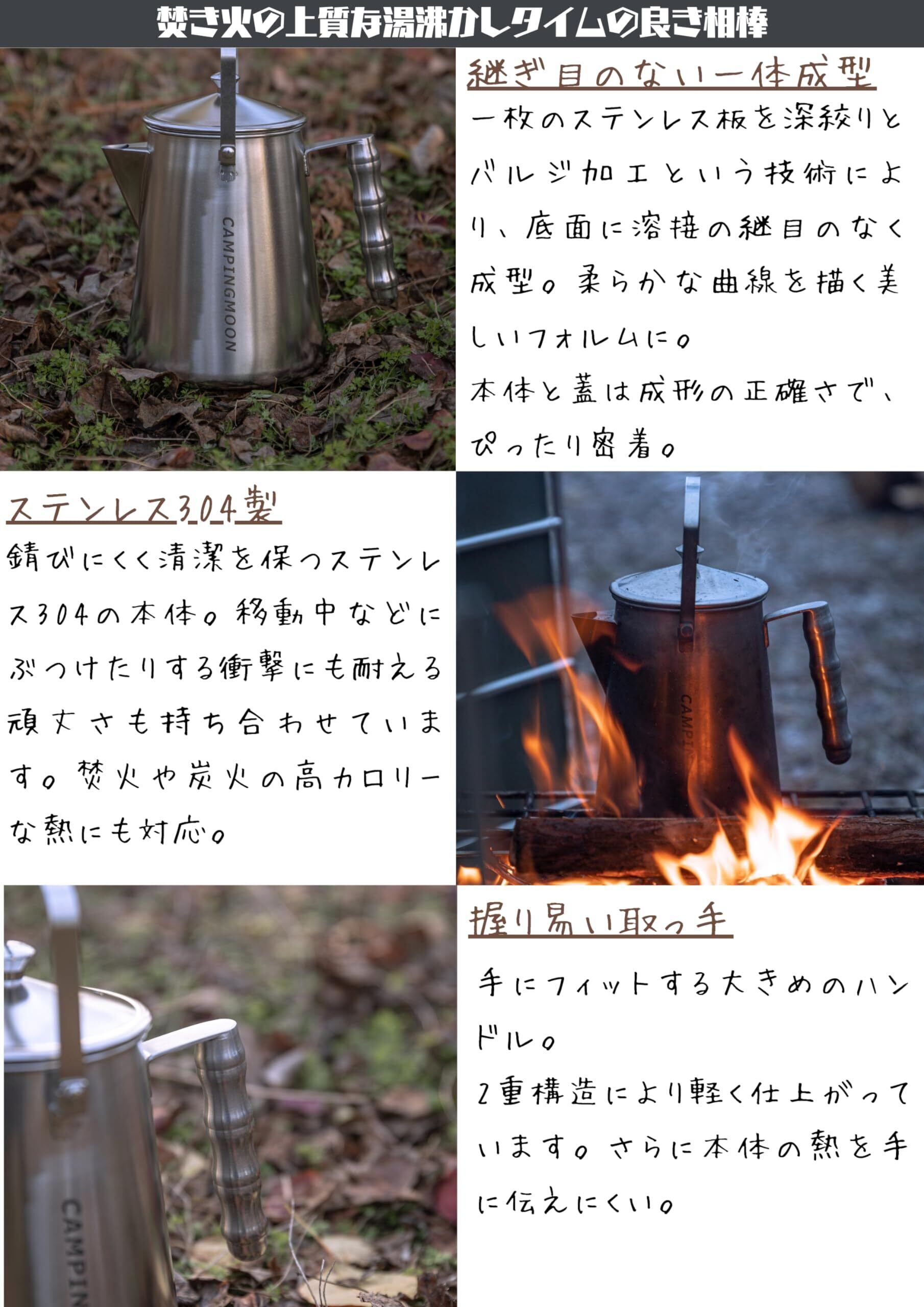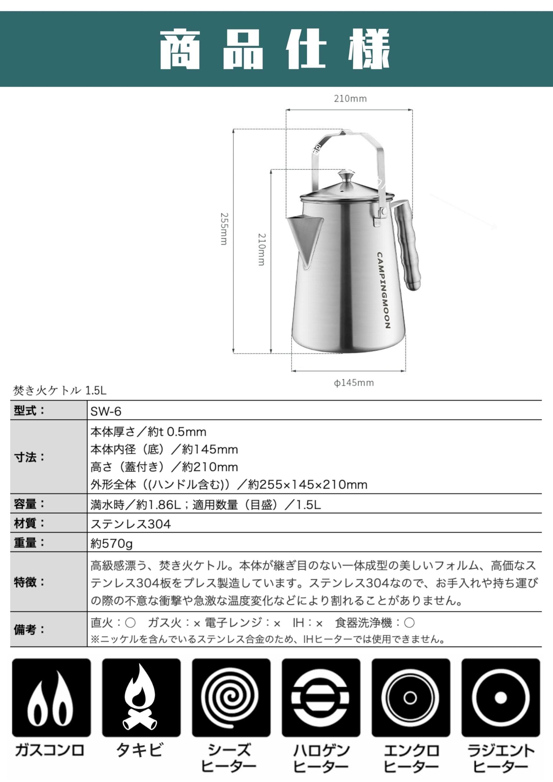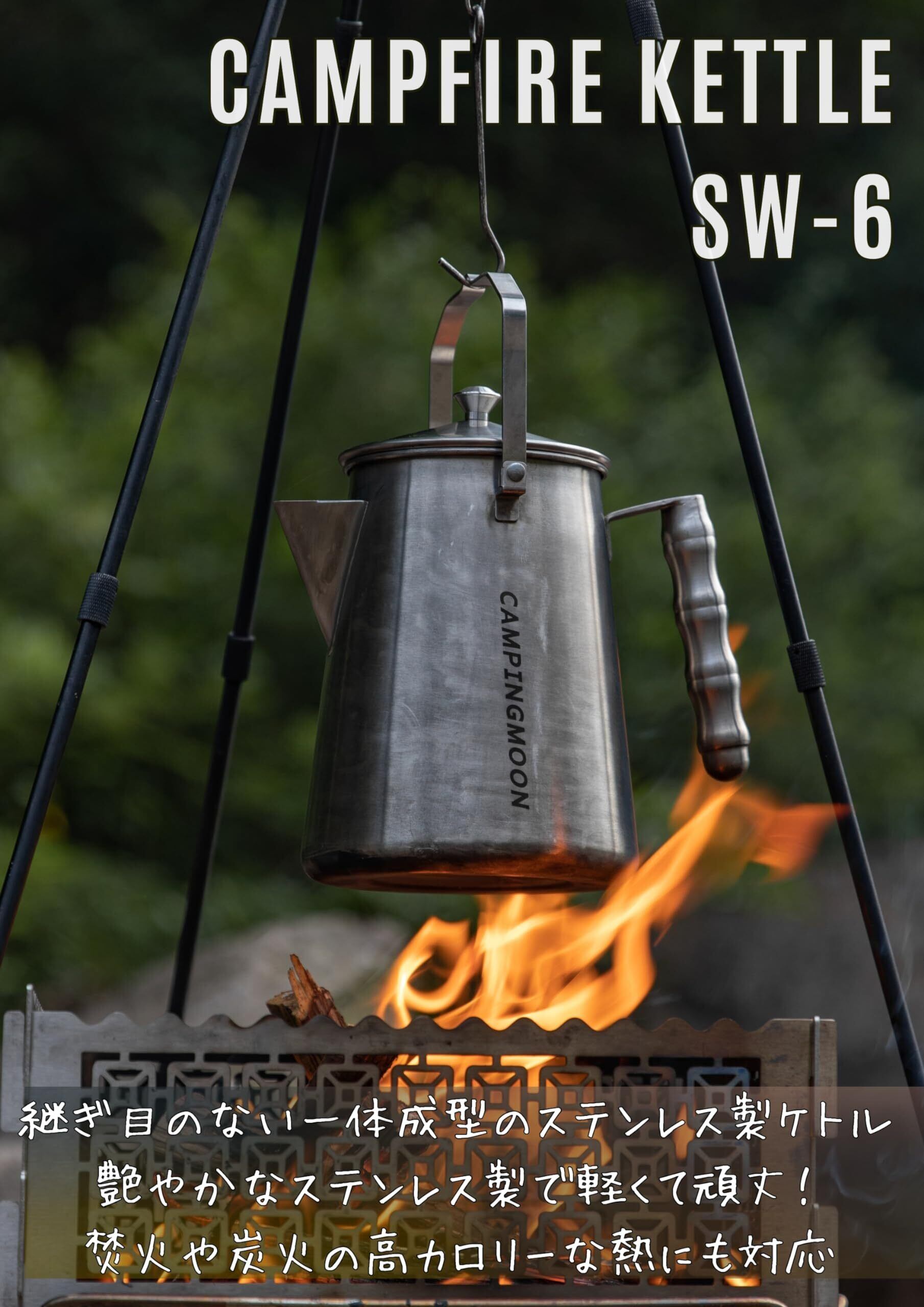 キャンピングムーン(CAMPING MOON) 焚き火 ケトル 直火 ファイアープレイスケトル キャンプケトル 一体成形 ステンレス304 1.5L SW-6