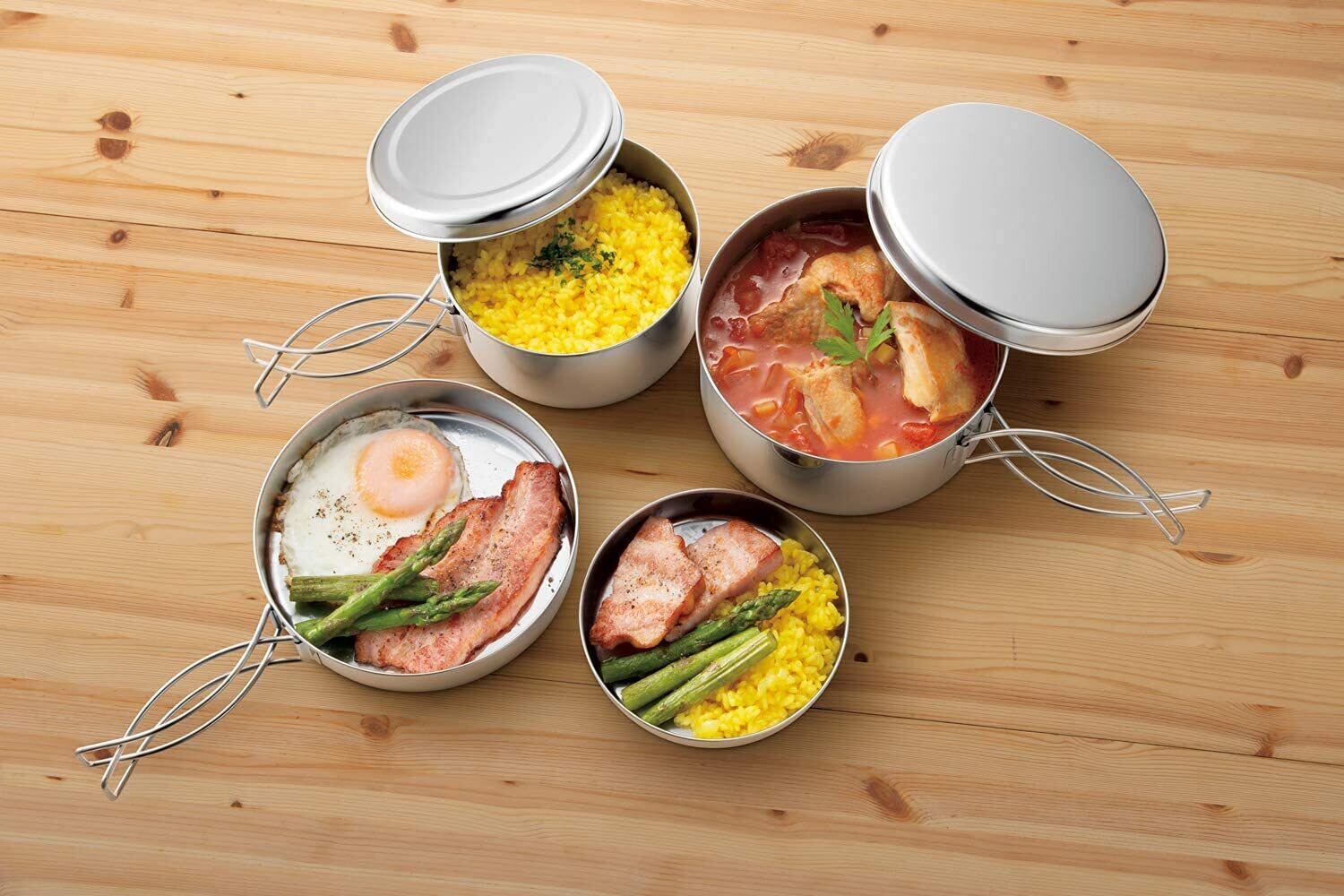 アウトドアの定番品。サビに強く、耐久性のあるステンレス製のアウトドア調理器セット。