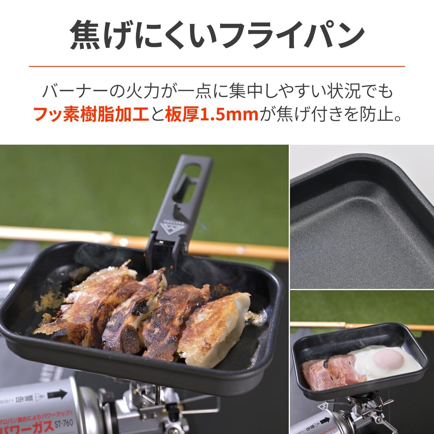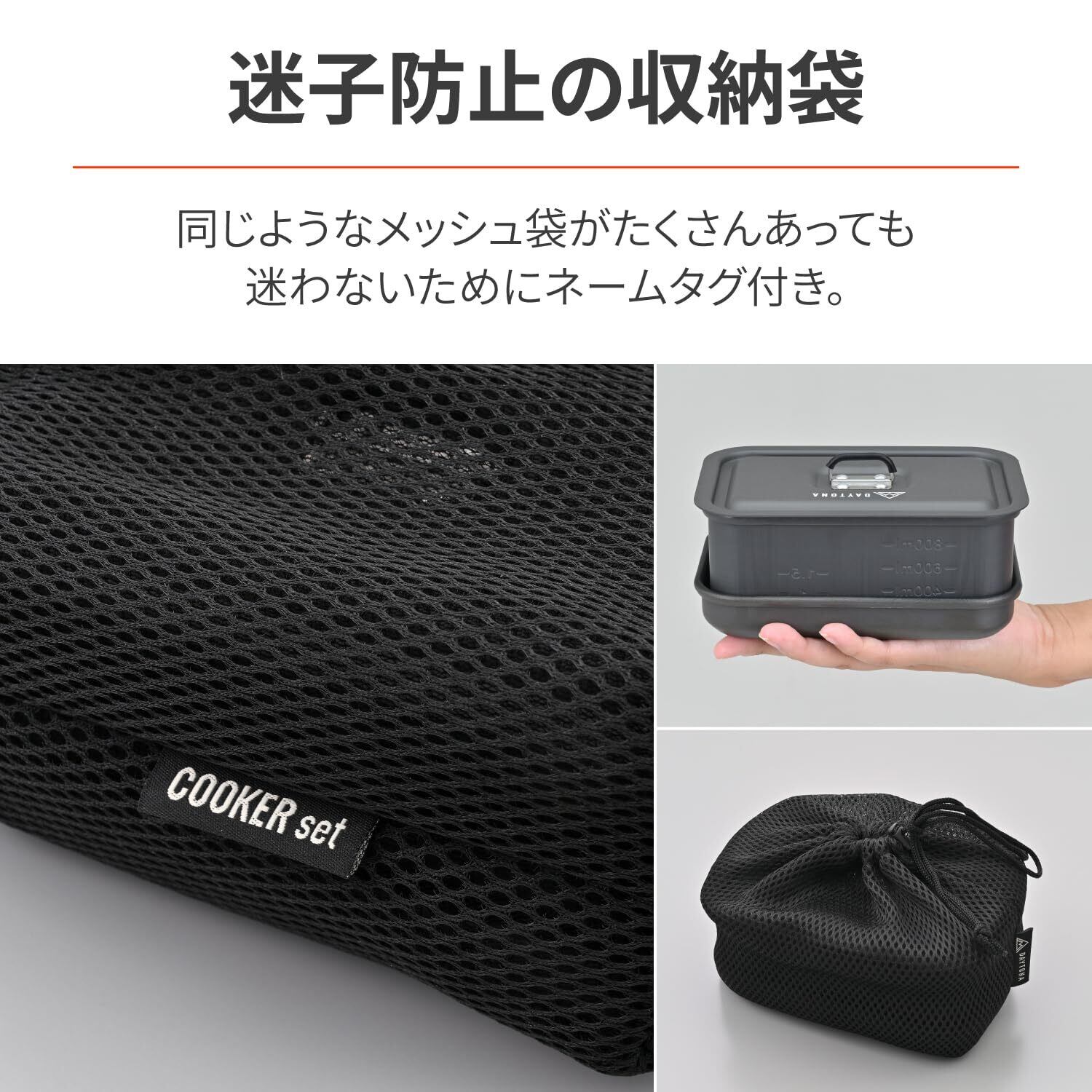 焦げ付き防止加工を施したフライパンとハードアルマイト加工を施した鍋とリッドがセットになったソロキャンプ向の基本調理セット。