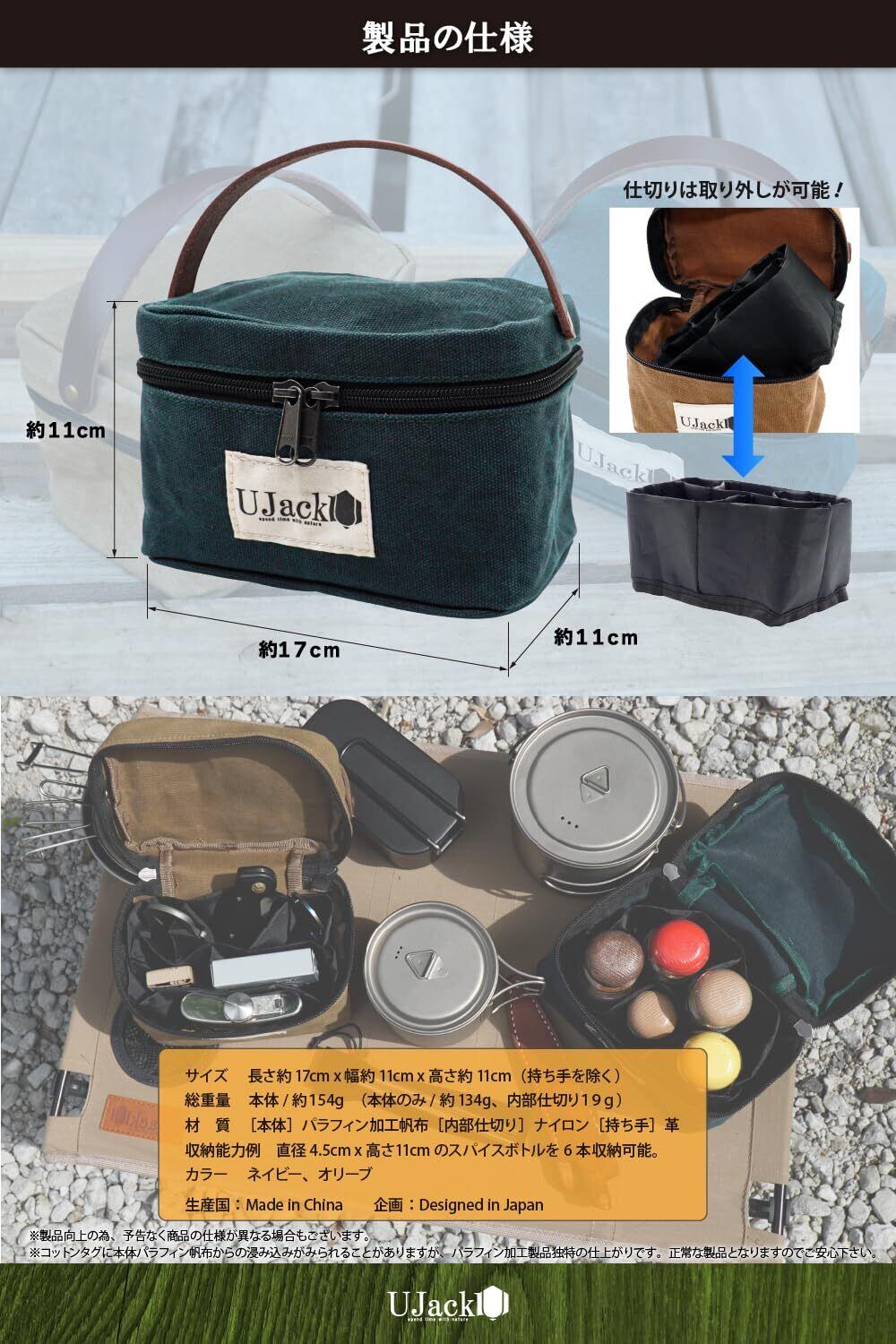 サイズ: 長さ約17cm x 幅約11cm x 高さ約11cm(持ち手を除く) 収納能力: 直径4.5cm x 高さ11cmのスパイスボトルを6本収納可能 重量: 総重量154g(本体134g、内部仕切り19g) 素材: パラフィン加工帆布(本体)、ナイロン(内部仕切り)、革(持ち手) カラー: ネイビー、オリーブ 生産国: Made in China、企画: Designed in Japan 防水機能: 帆布にパラフィン加工を施し、防水性を実現