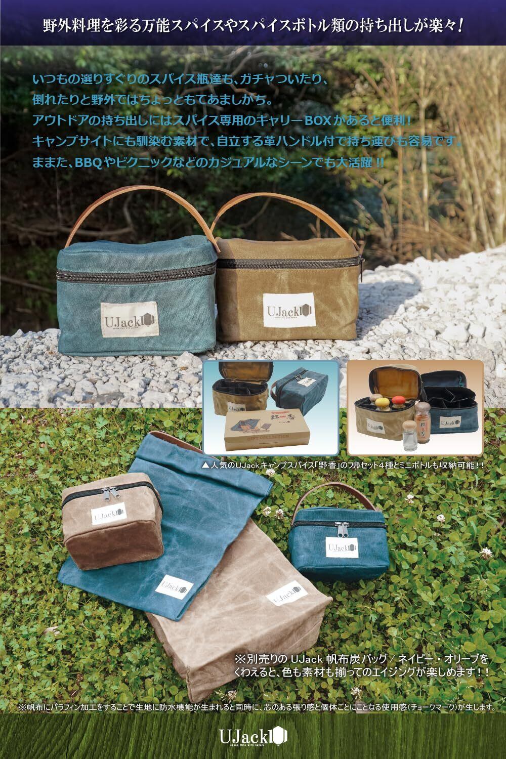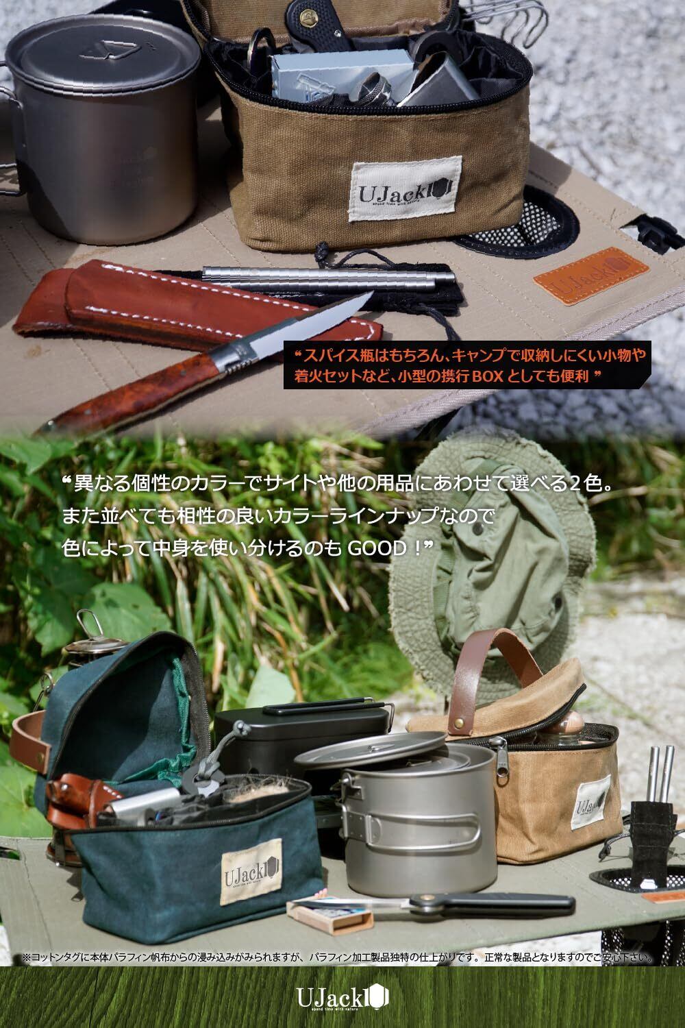 このスパイスボックスは、アウトドアやキャンプでの使用に最適なデザインと機能を兼ね備えたアイテムです。防水加工が施された帆布素材で作られており、パラフィンワックス加工によって個体ごとの独特な表情を持ち、使い込むほどに風合いが増します。また、革製の持ち手が付いており、持ち運びも楽です。