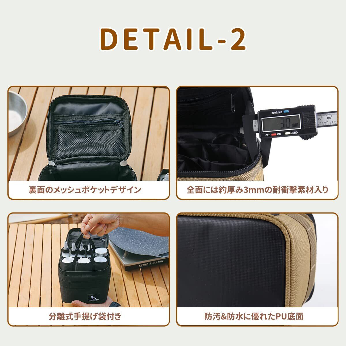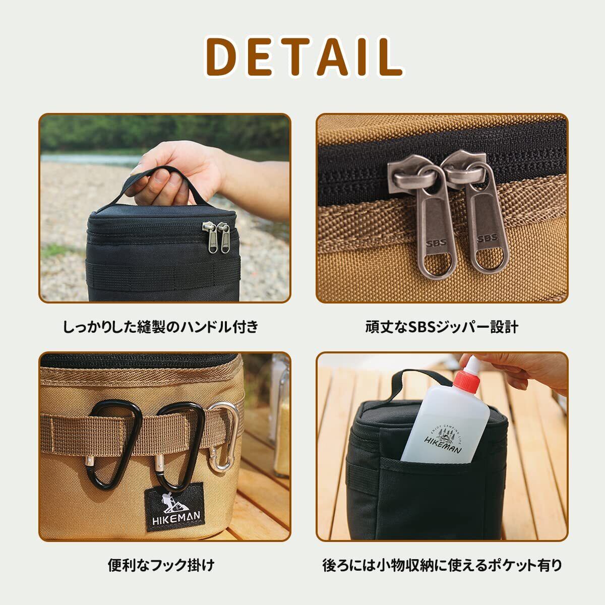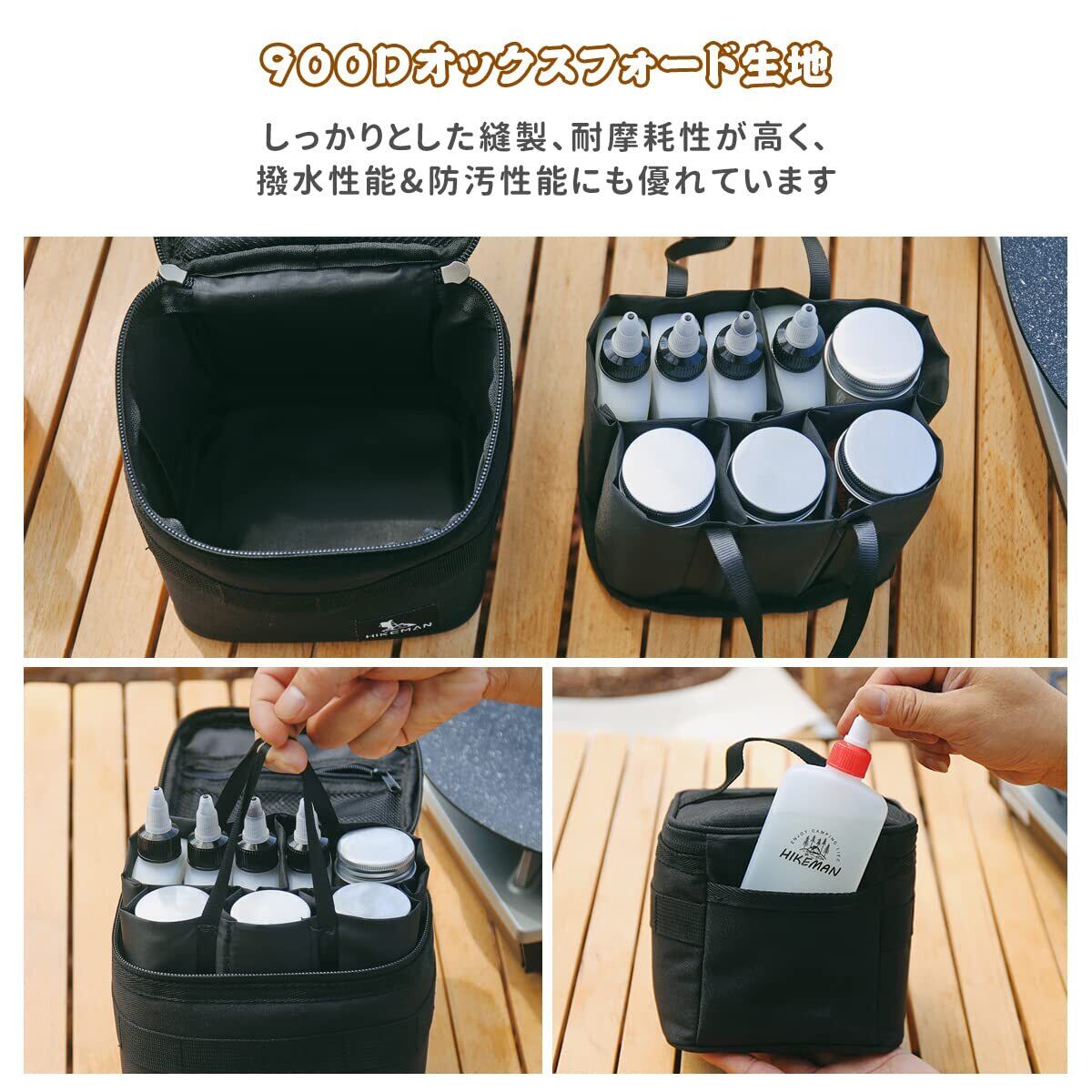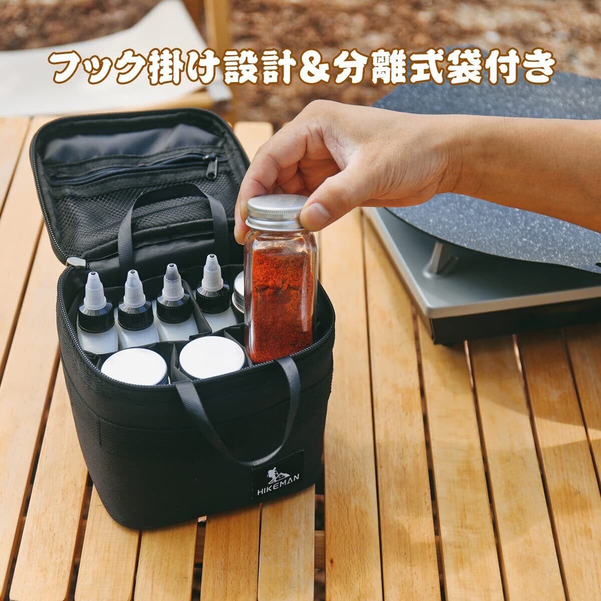 セット内容:手提げ付きの収納袋1個付き、調味料用品などきちんと整理整頓できます。本体と分けて使用可能、持ち運びも便利です。中身の袋を外して、テントロープなどの雑なキャンプ小物を入れてもいいです。※調味料ボルトは含まれていません