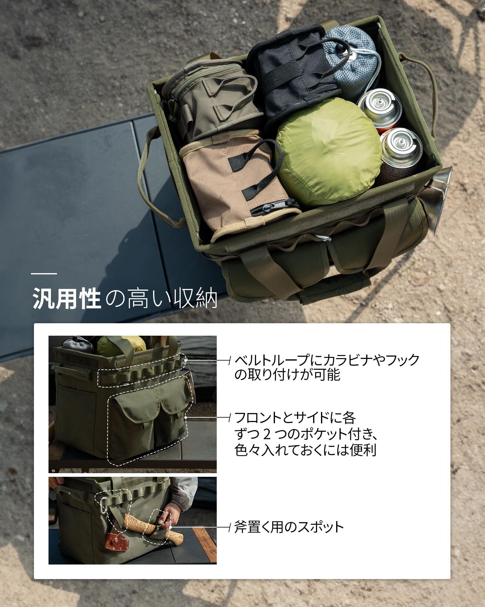 【大容量折りたたみソフトコンテナボックス】2024アップグレードされた25L大容量キャンプ用折りたたみギアコンテナ。軽量テントや寝袋などの大型アイテムを収納できます。小物収納に便利な外部マルチポケット設計、MOLLEと斧吊り下げ用ポイントを装備し、多面的な収納ニーズに応えます