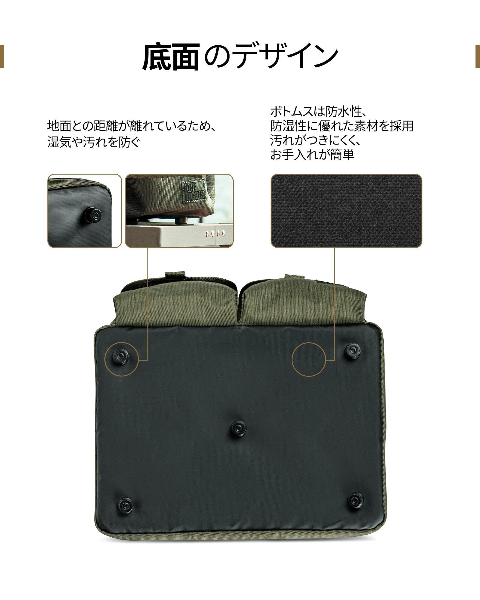 【足付き防水ボトム】底の素材は高防水性と耐湿性があり、アウトドアでバッグを濡れる心配はありません。足付きで地面から距離を保ち、バッグをキレイに保つことができます。お手入れも簡単、水拭きでOK!