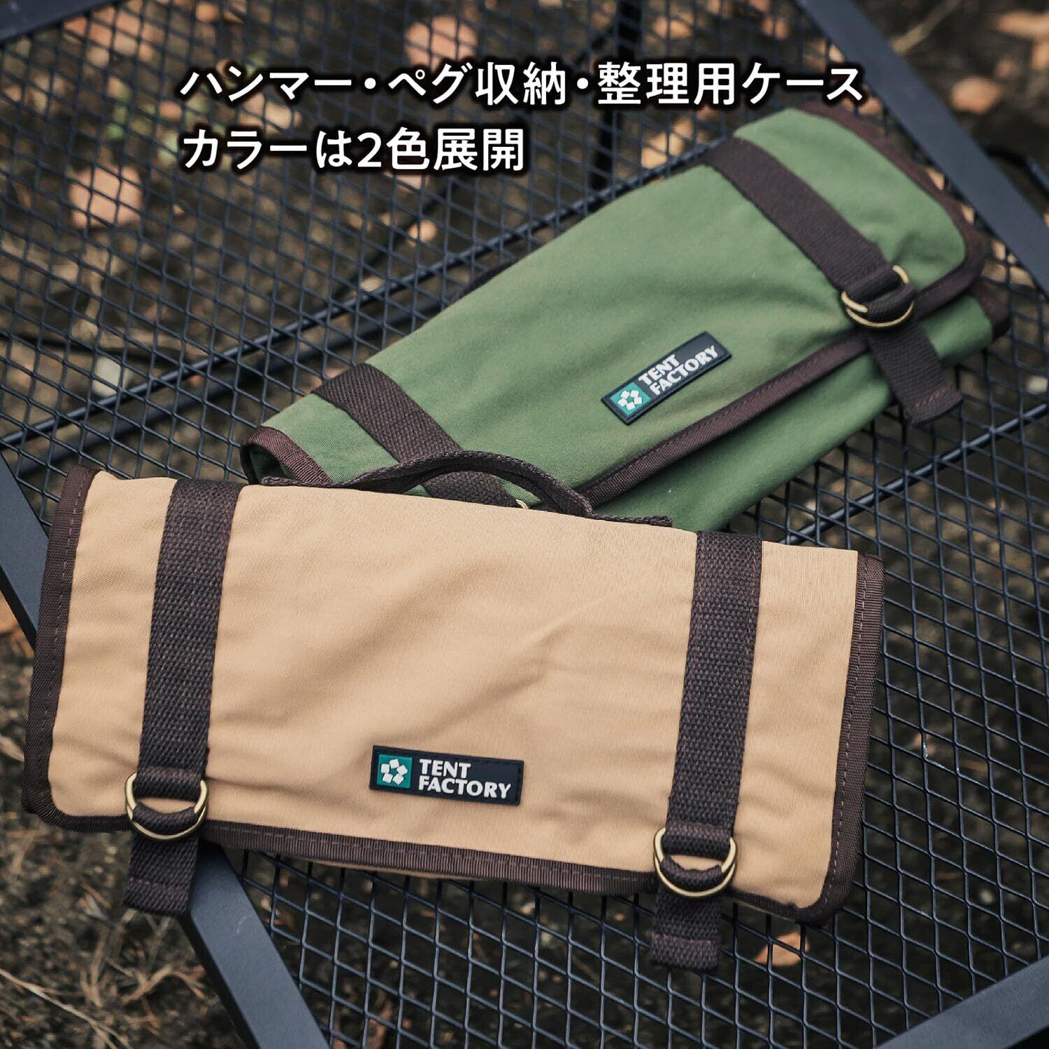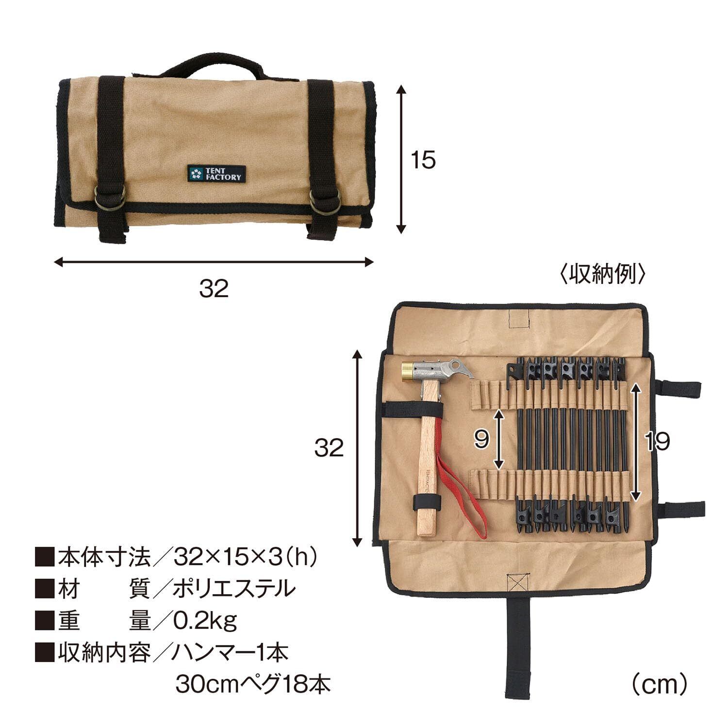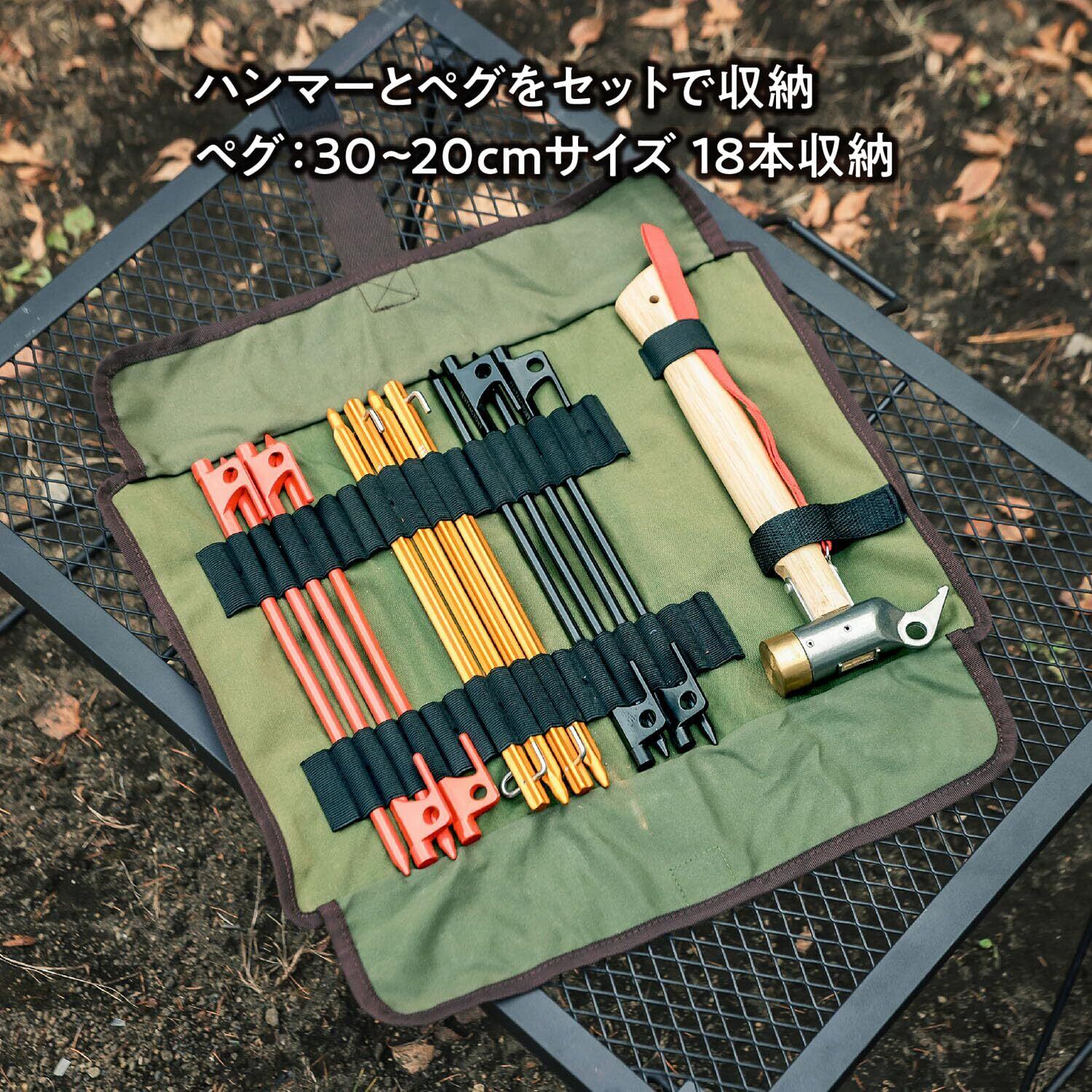 【ペグキャリーケース1】 ハンマーとペグがまとめて入れられるペグキャリーケース。 ■収納内容/ハンマー1本、30cmペグ18本 ■丸洗い可能