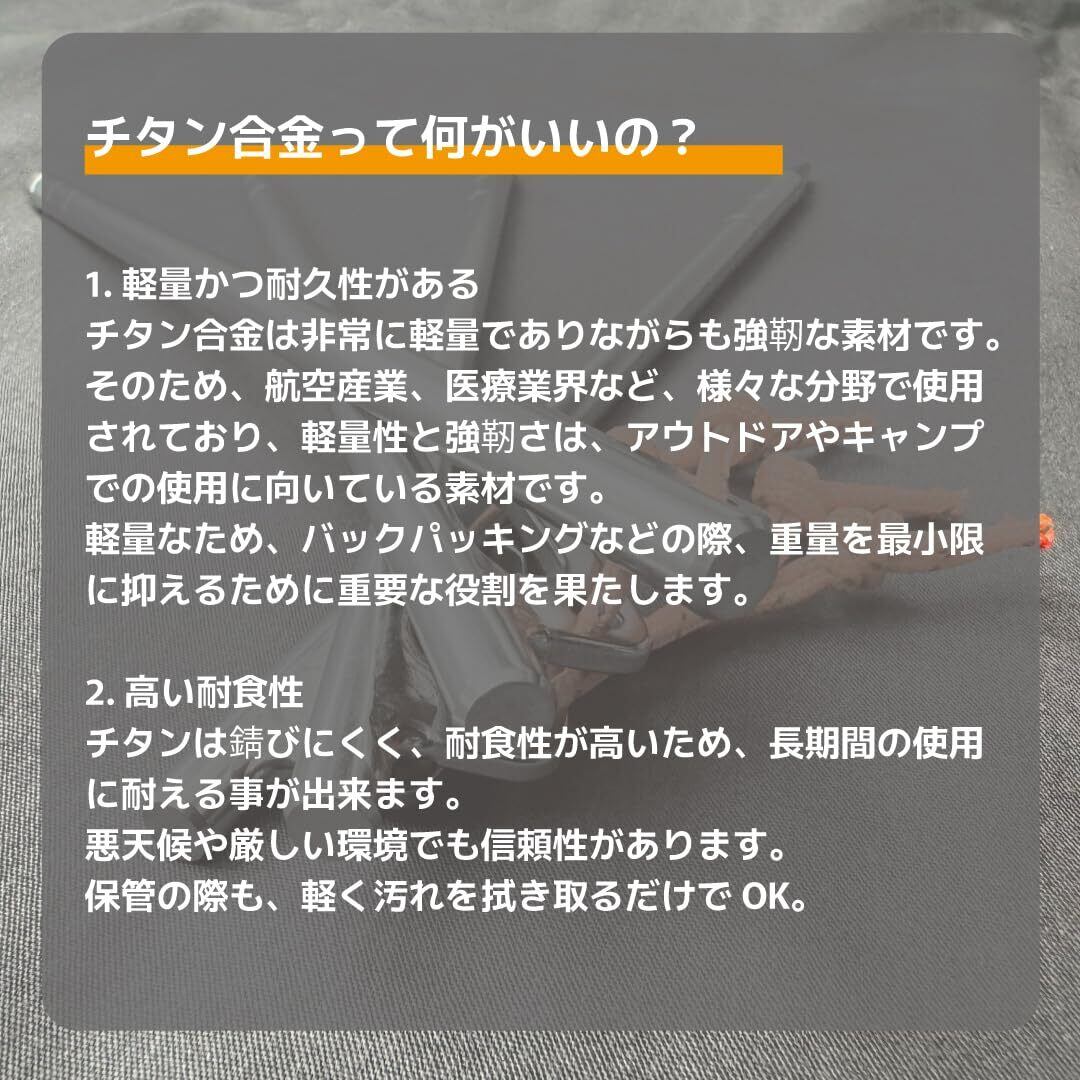 チタン合金は航空産業にも使われている耐食性の高い金属で、雨風のある厳しい環境でも錆びにくく長期間ご利用出来る最強のペグになっています。
