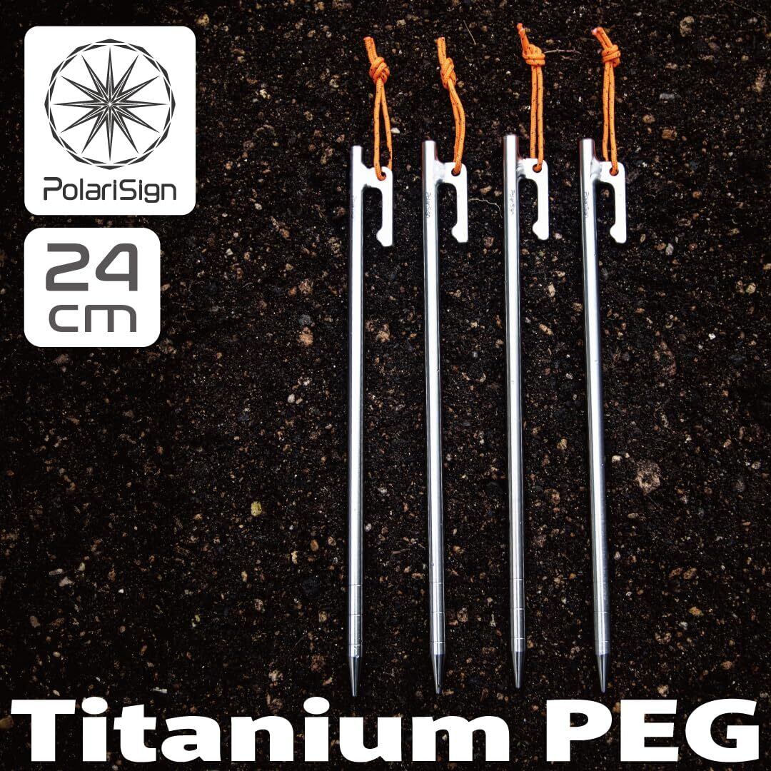 PolariSignチタンペグ20cm/24cm/30cm 4本/6本/8本セット キャンプ ペグ チタン製 反射材入りロープ付き テント用 タープ用 設営 ポラリスサイン (24cm, 4本セット)