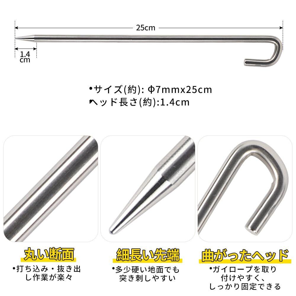 サイズ:太さɸ6mmx長さ20cm、太さɸ7mmx長さ25cm、十分な長さが備えて、砂地・礫地など柔らかい地面にもしっかり固定できます。先端は約2cmとなって、地面に打ち込みしやすいです。