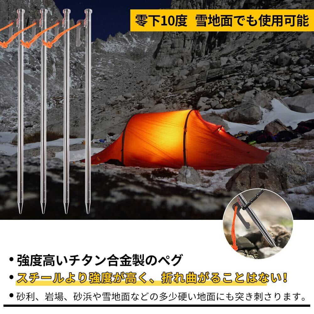 テント/タープ設営に活躍している:強度高いチタン合金製のペグはスチールより強度が高く、折れ曲がることはない!砂利、岩場、砂浜や雪地面などの多少硬い地面にも突き刺さりますので、テント/タープ設営に活躍しています。