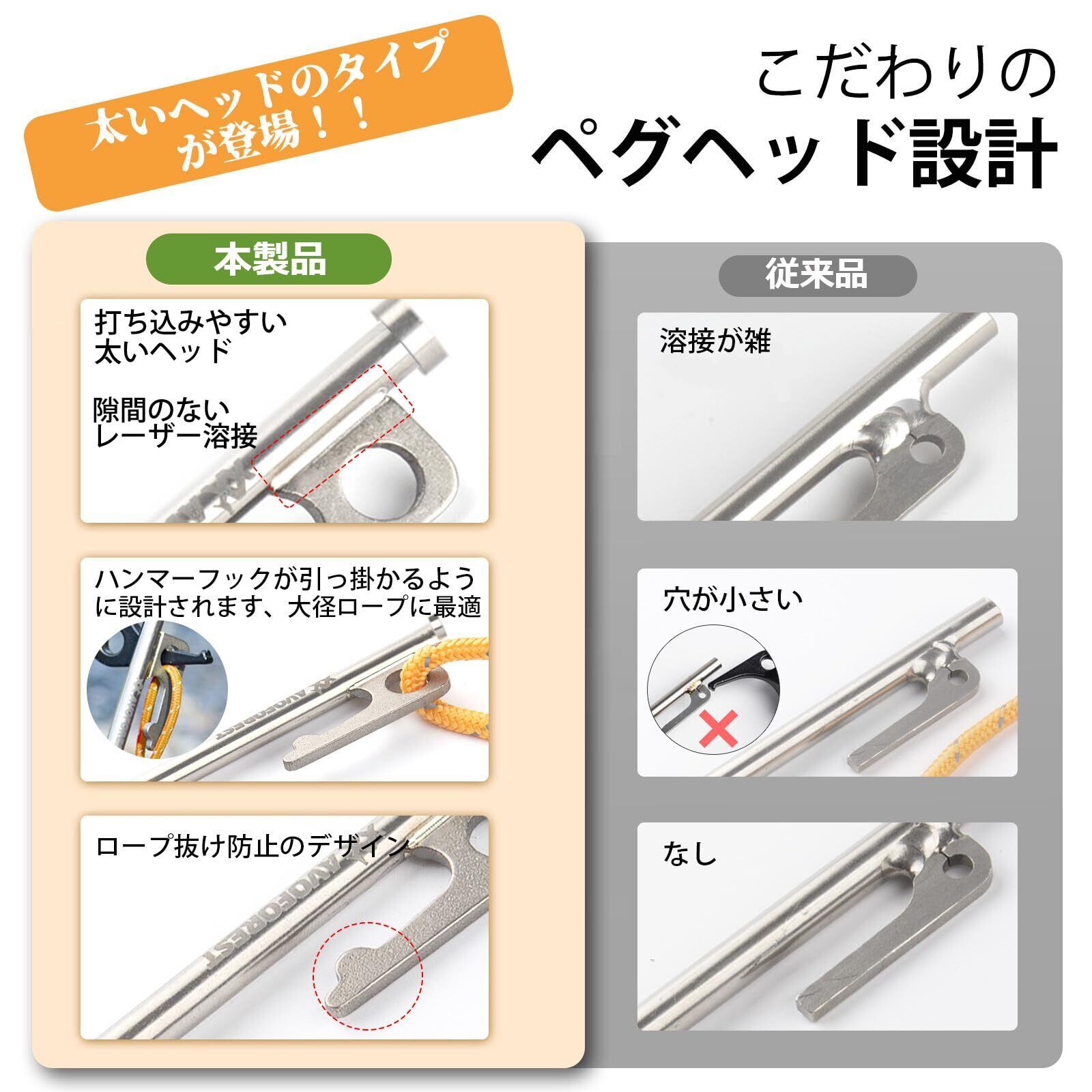 強度があるのに軽い: チタンペグは、どんな硬い地面でもガンガン打ち込める強度は抜群です。 鋳造ペグに負けない強度を持ちながら重さはその半分から3分の1にもなります。