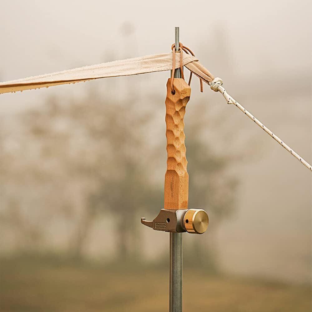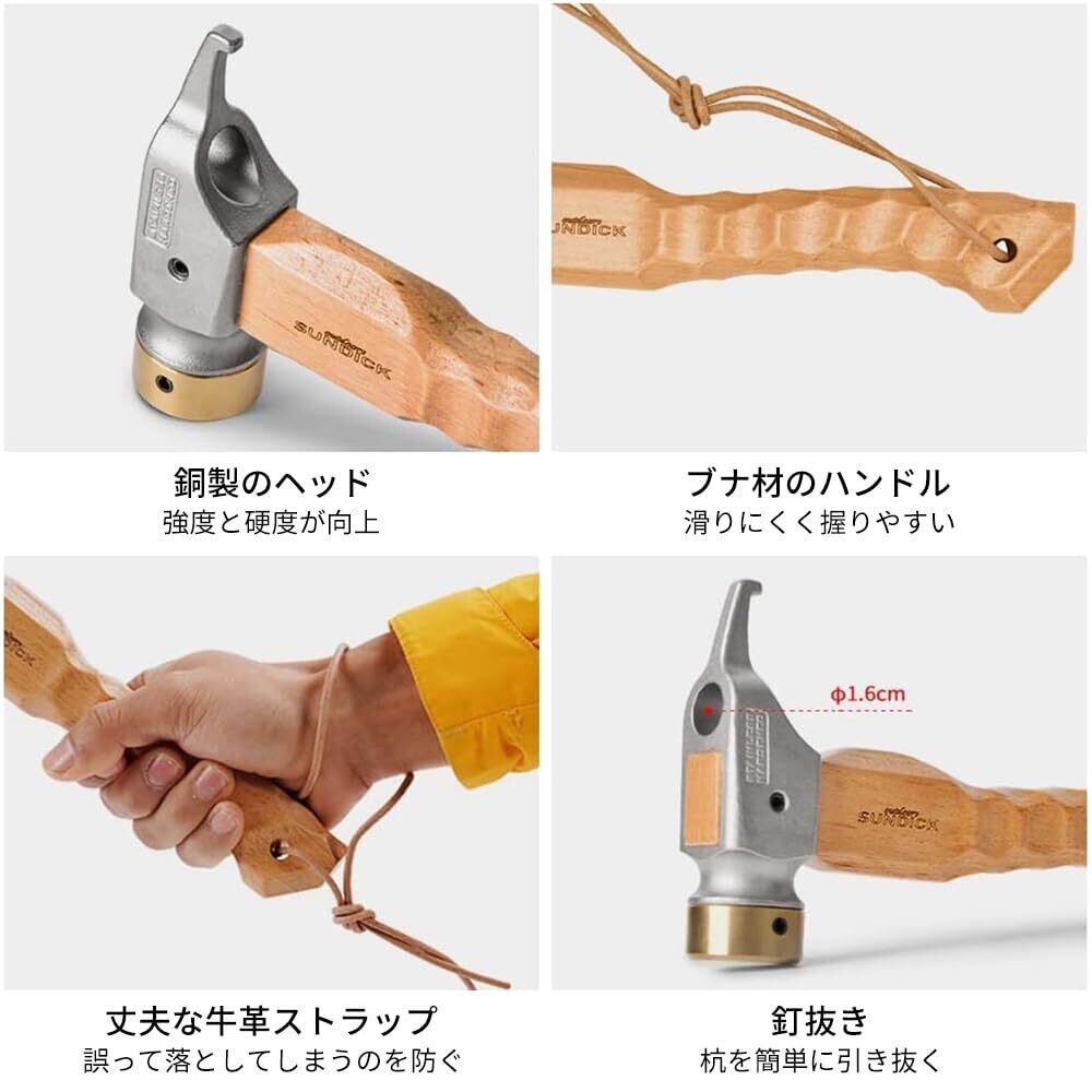 【軽量で丈夫な天然木製のグリップ】ハンマーの本体は、光沢があり大気中での腐食が少ないクロームメッキで塗装されており、防錆性能にも優れています。また、ペグや対象物を傷めにくい適度な強度を持っています。ハンマーの木柄には、天然木(ケヤキ製)を使用し、太さと曲線にこだわった設計になっています。グリップは、手に馴染みやすく、力を入れやすい丸みを帯びた名栗形状になっています。持ち運びやすく、特に女性に人気があります。全体的に、軽量で丈夫な天然木製のグリップが特徴です。