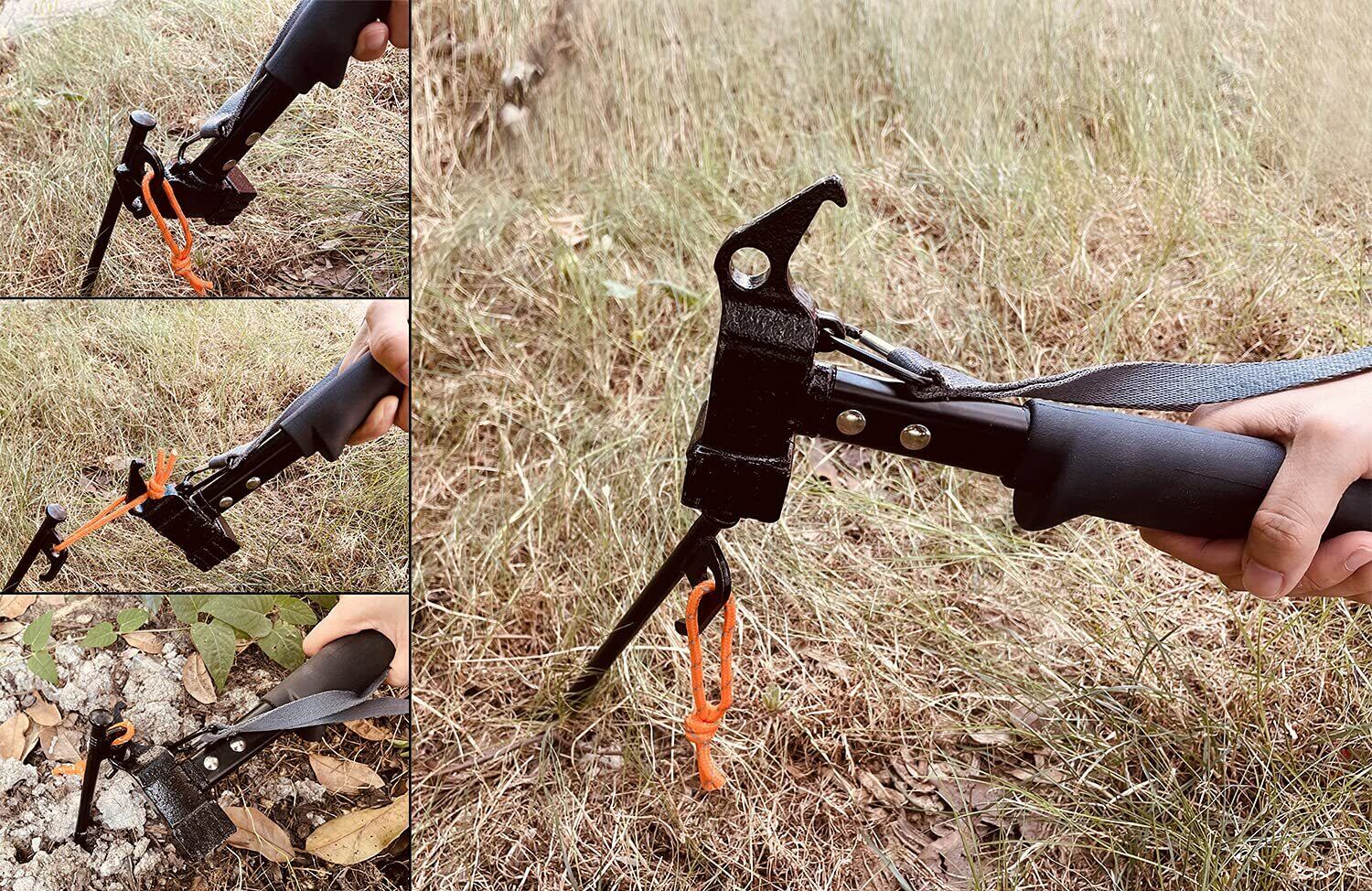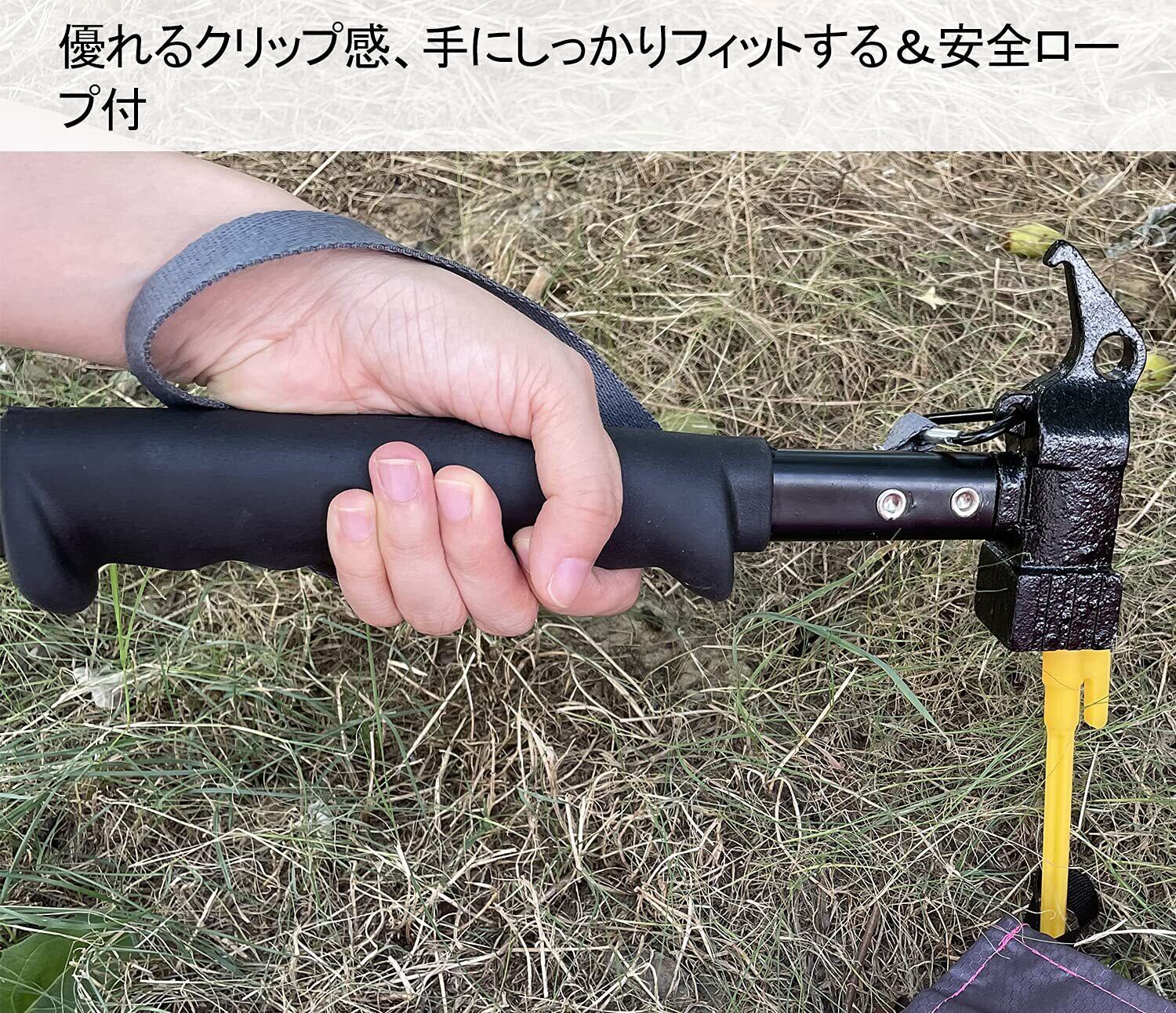 【デザイン】ヘッド部は角形鋳鉄製、頑丈で打込めやすい、ペグ抜きもポール型・フック型2種類に対応、持ち手部位にゴム製で優れるクリップ感があり、手にしっかりフィットできます。安全ロープ付で以外落下などの危険性を軽減できます。