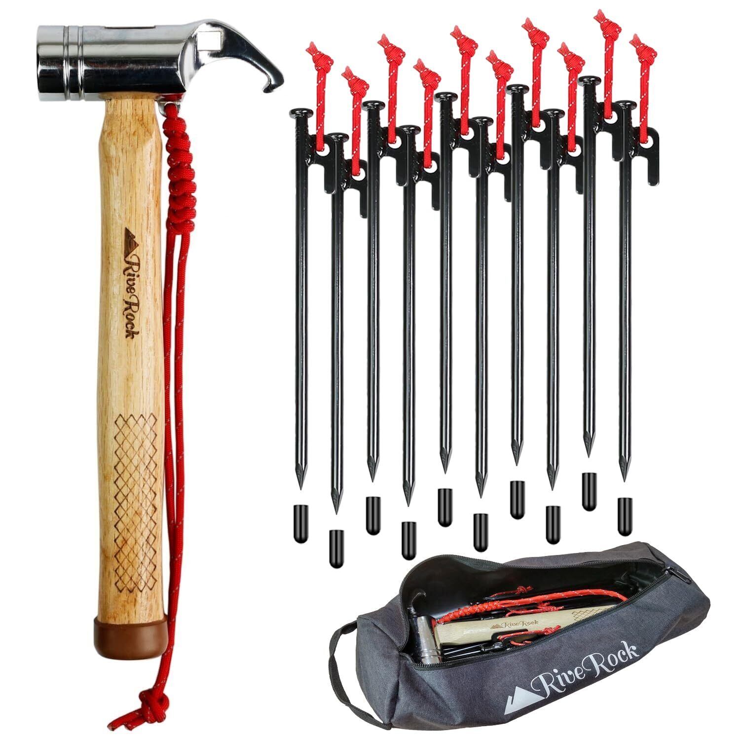 RiveRock(リバロック) ペグハンマー 収納袋 安全キャップ付き ペグ10本 夜光ロープ 強靭 (ハンマー+ペグ10本+収納バック/レッド)