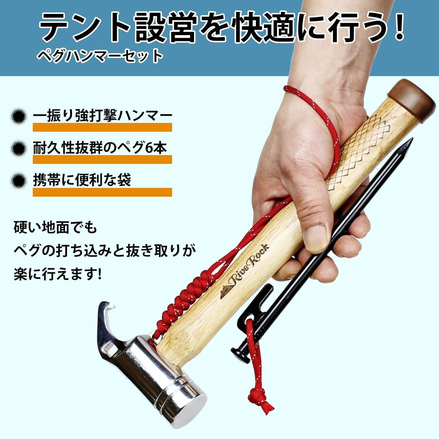 キャンプの必需品!ペグハンマー、ペグ、収納袋セットで快適なアウトドア体験を RiveRock(リバロック)のペグハンマーセットは、キャンプやアウトドア活動をより快適に、そして安全に楽しむための必需品が揃った便利なセットです。テント設営やタープ設営に欠かせないアイテムを一つにまとめました。