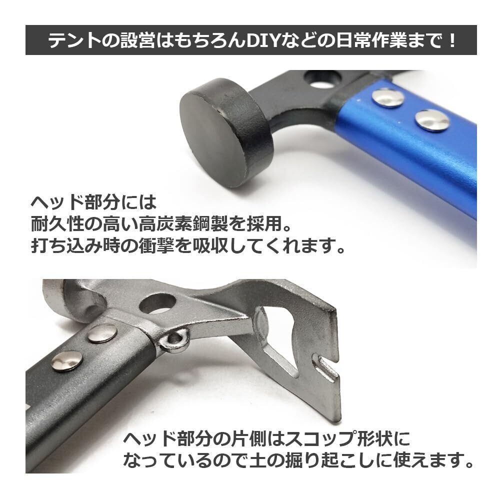 ペグを打つ、ペグを抜く、土を掘るの3つの機能がひとつになった多機能ペグハンマー。すっぽ抜け防止のストラップ付き。ストラップを手首に巻きつけて使用すれば、ハンマーが遠くに飛んでしまう心配がありません。軽量で扱いやすいハンマーなので、荷物の重量をできるだけ軽くしたいソロキャンプや登山などにおすすめです。テントの設営、タープやシェードを固定するペグを打ち込むときはもちろん、DIYなど日常作業にも使えます。キャンプやアウトドアははじめ、様々なシーンで大活躍してくれます。