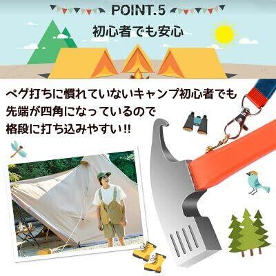 高温で焼き入れされた高硬度素材を採用しており、テントやタープを設営する際に必要なペグを軽い力で打ち込むことができます。
