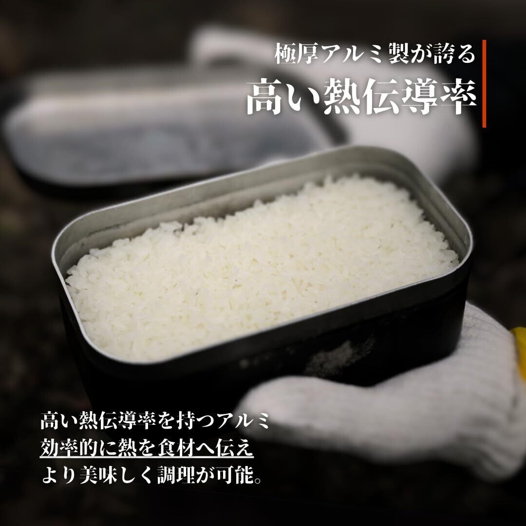 一般的なメスティンに比べて倍の厚み(本体1.5mm・フタ1.2mm)となるアルミ板で製作しました。ワンランク上のメスティンをご堪能ください。