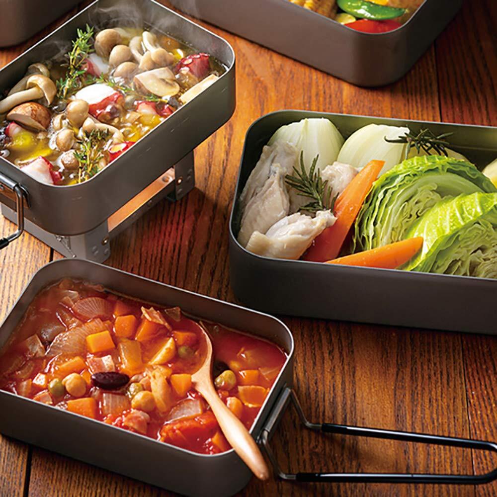 ●丈夫で熱伝導の優れたアルミ製メスティン。●アウトドアやキャンプなどで飯ごう、ハンドルが付いているのでフライパン・鍋などの調理器具として料理を作ることも出来ます。●ハンドルは折り畳んでコンパクトに収納出来ます。計量なので持ち運びに便利。●フタをした際に材料の押し潰れを防ぐふわっとフタ。飯ごう炊飯、焼く、蒸す、煮るのクッキングレシピ付。