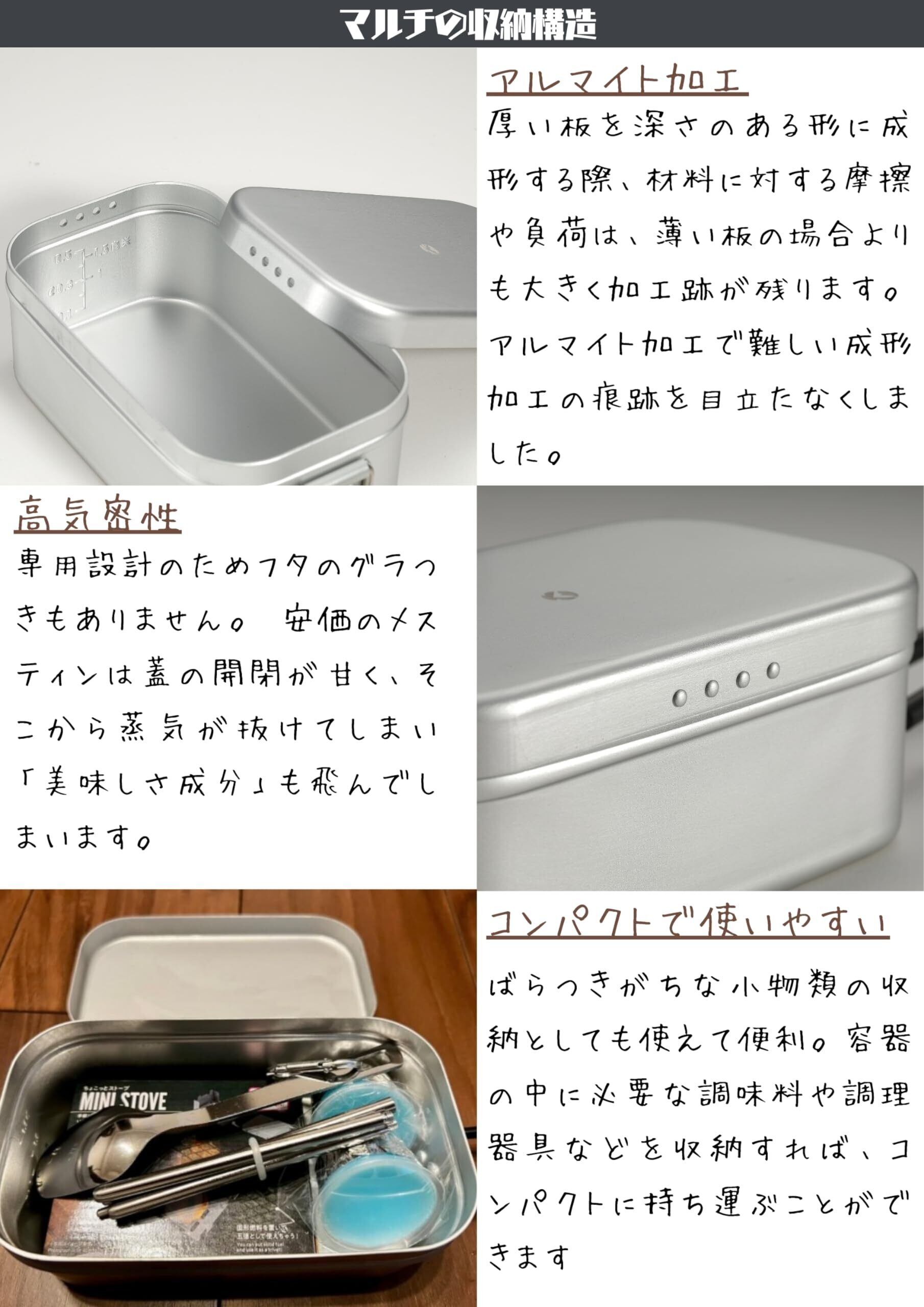 一般的なメスティンに比べて倍の厚み(本体・フタ1.5mm)となるアルミ板で製作しました。ワンランク上のメスティンをご堪能ください。