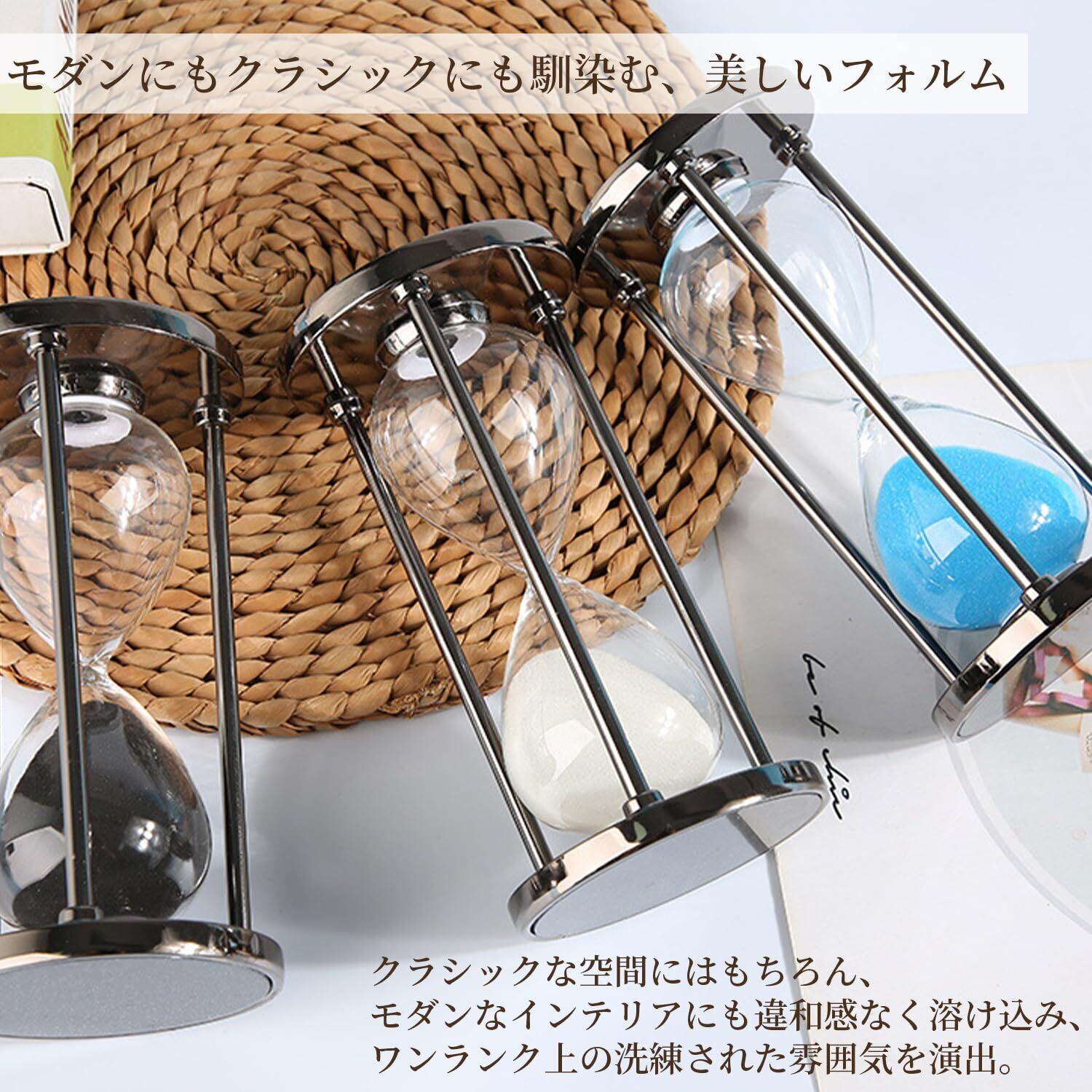 洗練されたデザインと実用性を兼ね備えた砂時計。シンプルでありながら高級感のある金属フレームが特徴で、インテリアとしても映える一品です。砂の色によって時間が異なり、サウナ、勉強、料理、ヨガなど、さまざまなシーンで活躍します。