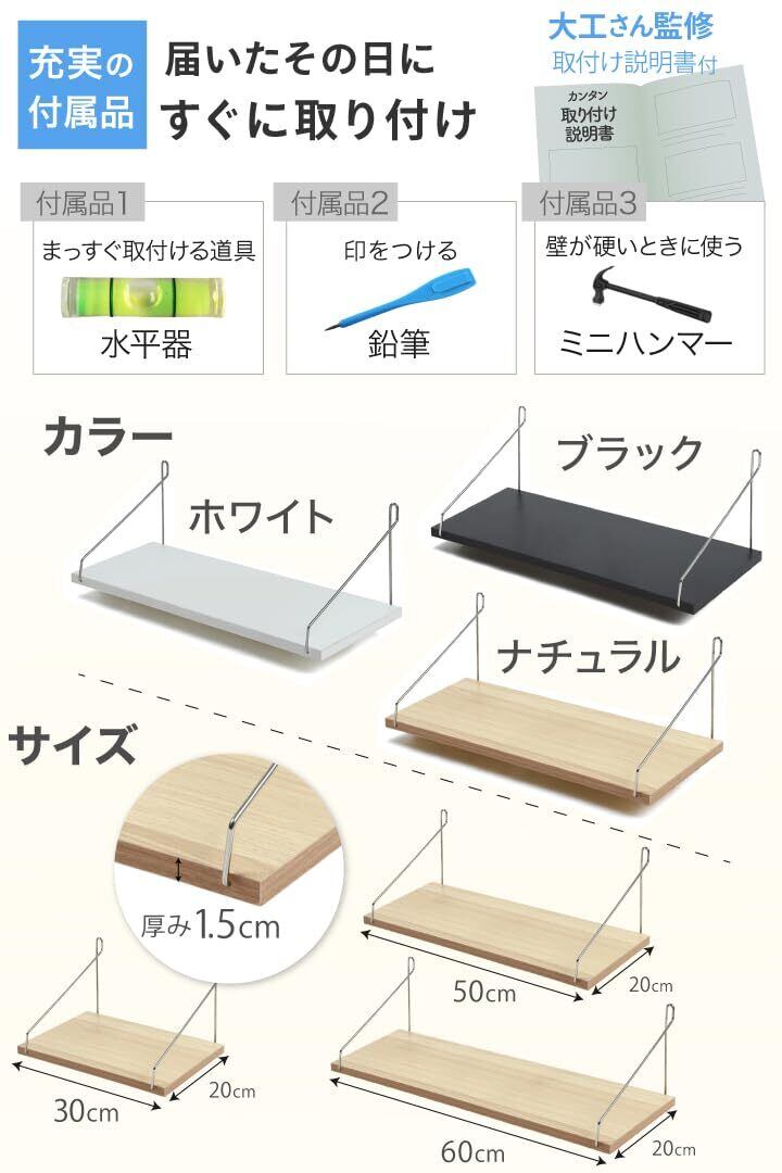 サイズは30cm・50cm・60cmの3種類、カラーはブラック・ホワイト・ナチュラル(木目)から選択可能。水平器・鉛筆・ミニハンマー、大工さん監修の詳しい取り付け説明書とオンラインマニュアルが付属。DIY初心者でも安心して設置できます。元大工さんによる相談サポートもあり、充実のアフターケア体制で賃貸住宅での取付をサポートします。
