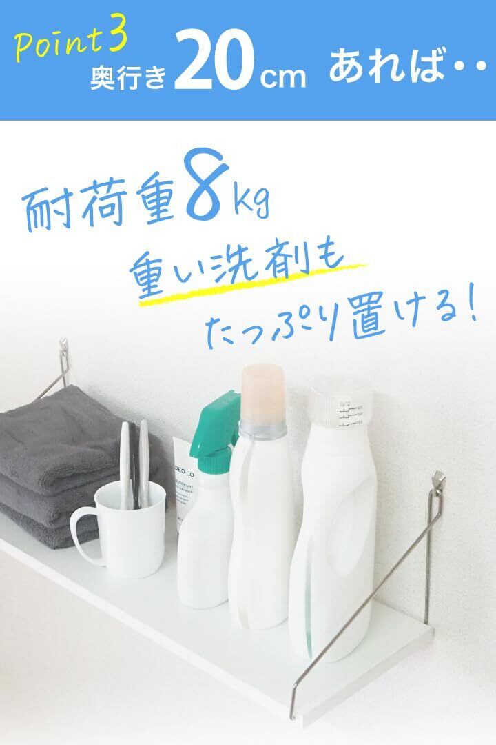 【実用性抜群の奥行き20cmタイプ新登場!賃貸でも安心のウォールシェルフ】 当店オリジナルの実用的なウォールシェルフセットが、さらに使いやすくなって新登場しました。賃貸住宅にお住まいの方も、持ち家の方も、誰もが簡単に取り付けられる壁掛け棚として大好評です。新しい奥行き20cmタイプは、日常生活での使いやすさを追求した、まさに「暮らしの救世主」とも言えるウォールシェルフです。 【賃貸でも安心!壁を傷つけにくい取り付け方法】 賃貸住宅では壁に穴を開けることを躊躇する方も多いですが、このウォールシェルフなら安心です。 取付はとても簡単。フックを壁に刺して引っ掛けるだけ。わずか2分で完了です。フックが刺さりにくい場合もご安心ください。付属のミニハンマーでかる~く叩けばキレイに刺すことができます。女性の方でもラクラクです。 また、賃貸物件でも気軽に使用できる、壁に優しい設計になっています。取り付け後も小さな針穴(画鋲くらい)が空くだけなので、引っ越し時の原状回復も簡単。賃貸生活者の強い味方となる壁掛け棚です。 【実用性を重視した奥行き20cmの棚】 従来の15cmタイプよりも奥行きが増えたことで、ウォールシェルフとしての使い勝手が格段に向上しました。 - バスタオルがキレイに置ける:15cmタイプではみ出していたバスタオルも、20cmタイプの棚ならすっきり収まります。 - 高い耐荷重:8kgまでの耐荷重がある頑丈な棚なので、重い洗剤を何個も置いても安心です。そのヒミツはダブルピンフック!針が2本あり、強力に壁に固定できるので、安定性抜群です。 - 大容量:トイレットペーパーを12個置いてもまだ余裕がある、収納力抜群のウォールシェルフです。 【水回りでも安心の耐水性ウォールシェルフ】 耐汚染性・耐候性・耐水性のある化粧板を使用した棚板は、水回りでの使用も安心です。洗面所や洗濯機上部など、湿気の多い場所でも安心して使えるウォールシェルフとして、賃貸住宅でも人気急上昇中です。 【棚のサイズとカラーが豊富】 新しいセット内容: - 30cm:1枚 / 3枚セット - 50cm:1枚 / 2枚セット - 60cm:1枚 / 2枚セット カラー:ブラック、ホワイト、ナチュラル(木目) 賃貸のお部屋に合わせて、ぴったりの棚を選べます。 【失敗しない!充実の付属品】 水平器・鉛筆・ミニハンマー、さらに大工さん監修の詳しい取り付け説明書とオンラインマニュアルが付属。DIY初心者の方でも、賃貸住宅で簡単にウォールシェルフを取り付けられます。元大工さんによる相談サポートもご利用いただけるので、安心して設置できます。 【多様な用途で活躍するウォールシェルフ】 洗面所収納、ランドリー収納、キッチン収納、トイレ収納など、実用的な使用シーンで大活躍する壁掛け棚です。洗剤置き、タオル置き、トイレットペーパー収納、調味料置きなど、日常生活に欠かせないアイテムをすっきり収納できます。賃貸住宅特有の収納スペース不足を解消する、頼もしいウォールシェルフです。 奥行き20cmの新タイプウォールシェルフは、単なるインテリア用の棚ではありません。毎日の生活をより便利にする実用的なアイテムとして、賃貸住宅でお悩みだった収納問題を解決します。洗面所、トイレ、キッチン、ランドリースペースなど、収納に困っていた場所の強い味方となる壁掛け棚です。 壁掛けタイプのこのウォールシェルフは、床スペースを取らないので、狭い賃貸物件でも効率的に空間を活用できます。耐水性に優れているので、水回りでの使用も問題なし。賃貸生活での収納の悩みを解決し、毎日の暮らしをもっと快適に、もっと便利にする、そんな実用的なウォールシェルフをぜひお試しください。 賃貸住宅での壁面収納にお悩みの方、使いやすくて丈夫な棚をお探しの方、水回りの整理整頓に困っている方、このウォールシェルフがきっとあなたの生活を変えます。賃貸でも安心、簡単取付、高耐久性の壁掛け棚で、あなたの暮らしをもっと快適に、もっと便利にしませんか? ▼もし取り付けに失敗したら・・ ・硬い壁に刺してしまい、フックの針が折れてしまった ・付属のフックをなくしてしまった ご安心ください! ご注文後、折れた、なくしたとご連絡いただければフックを2本まで無償でお送りしております。 万が一取り付けに失敗しても安心です。 ※フックや横揺れに防止品が破損、紛失してしまったら、その状況(破損であれば写真)を添えてメッセージにてご連絡ください。 1注文につきそれぞれ2個まで無償でお送り致します。ポスト投函でのお届けとなります。 ※無償提供はご注文から3ヶ月以内に限ります。その後は有償になります。 【セット内容】 棚板(セット内容によって長さが異なります)1~3枚 ワイヤー 板数×2本 アイアンフック 板数×2本 水平器 鉛筆 ミニハンマー 取り付け説明書 【製品仕様・注意】 素材:板/MDF ワイヤー/鉄 耐荷重:8kg 【サイズ】 長さ(幅):30cm・50cm・60cm 奥行き:20cm 高さ:17cm(板の下からワイヤーの頂点) ※若干