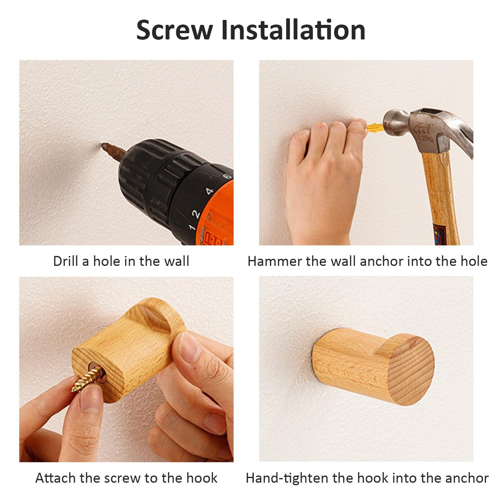しっかりと固定:木製ハンガーはネジで固定するタイプのため、しっかりと壁に固定することができ、最大耐荷重は約13KGまで可能です。取付も簡単で、壁にドリルで穴を開け、アンカーを打ち込んでから、ネジをつけたコートフックを締めばOKです。