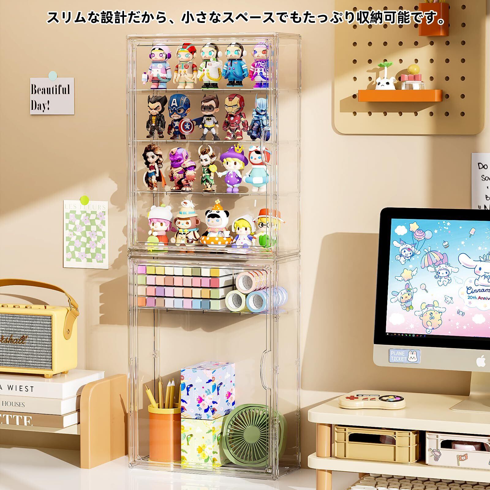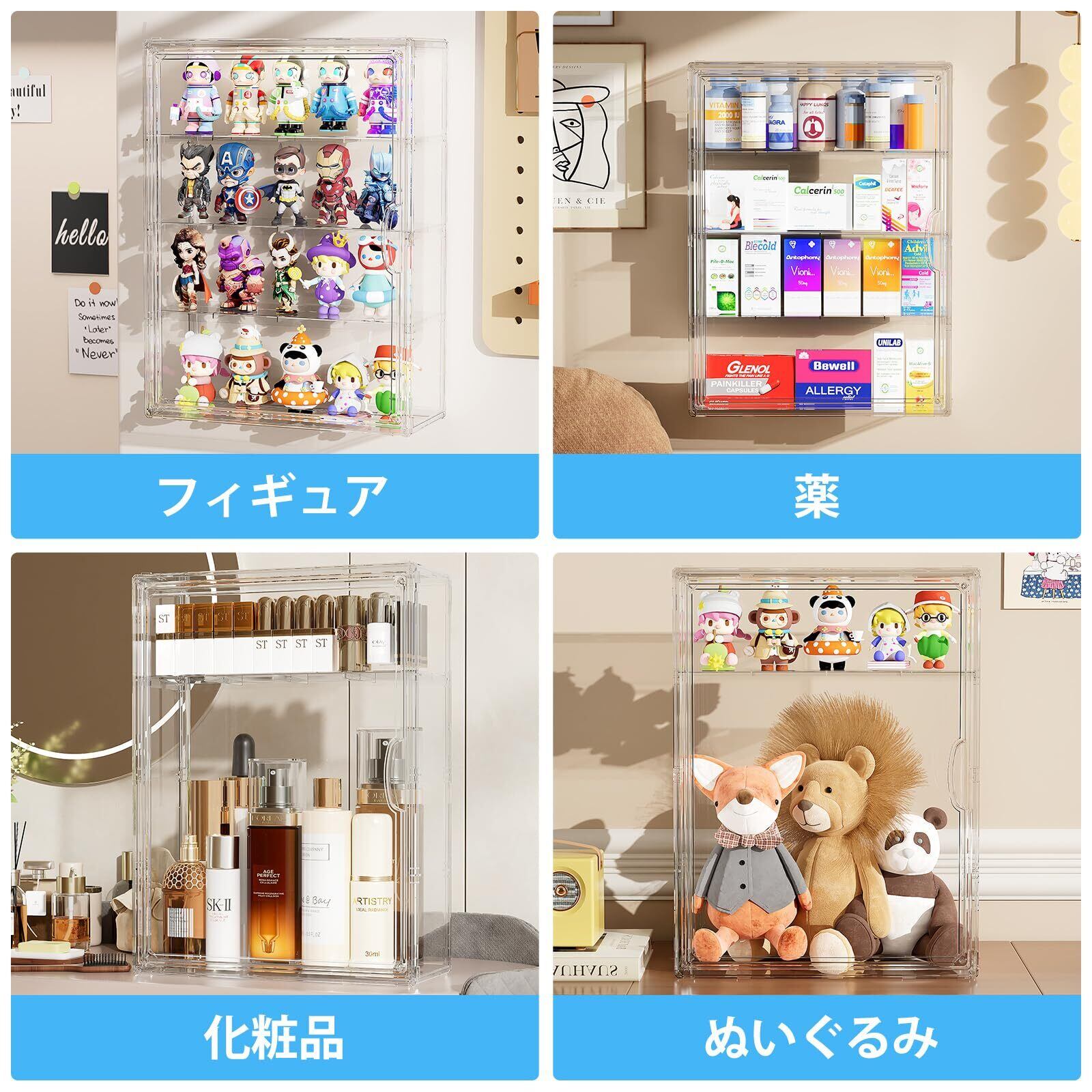 【広範な応用】フィギュアや人形、コレクション収納、模型、推し活グッズ、本、靴、バッグなど、様々なアイテムを整理可能。寝室・デスク周り・展示会・キッチン・オフィスなど、ショーケースの使用場所を選ばず活躍します。
